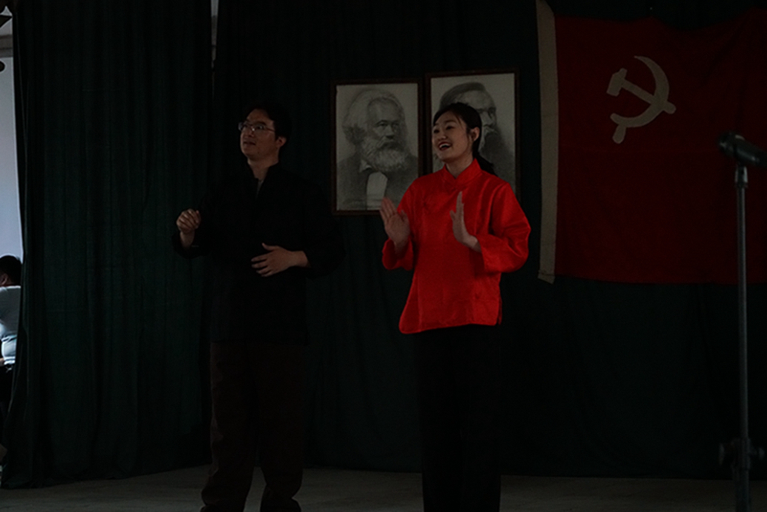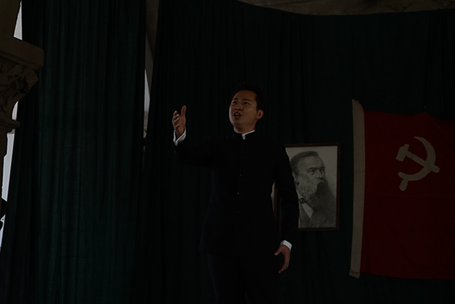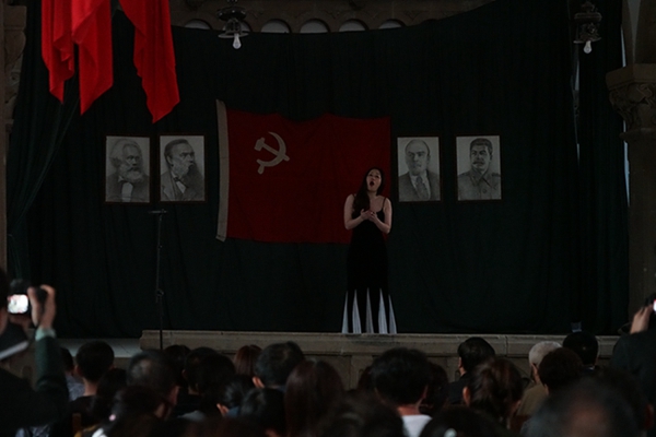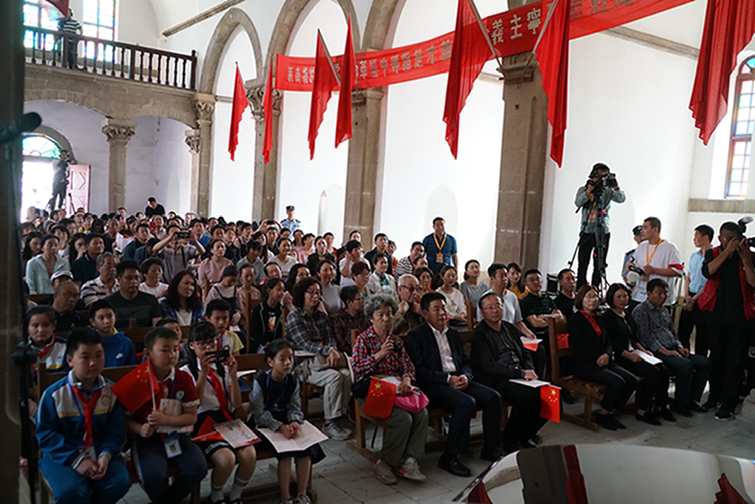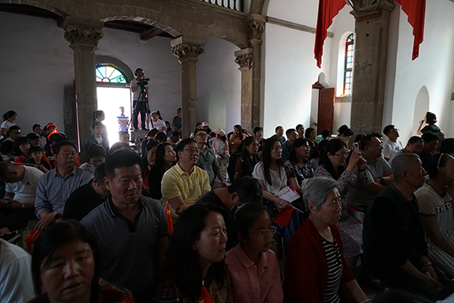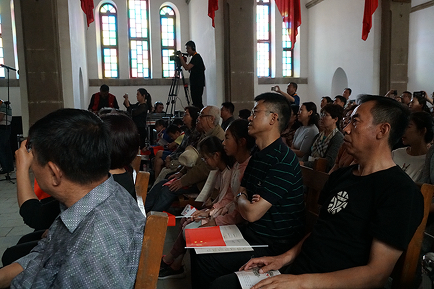 尤其值得一提的是,音乐会是在鲁艺旧址的大教堂举行,这是这座教堂时隔74年(延安鲁艺1945年迁往东北)以来的首次演出。这栋建筑历经风雨战火,墙体剥蚀,铺地灰色的青砖坑坑洼洼变成黄土色,然而当嘹亮的歌声灌满整个厅堂、在红色的横幅中激荡,庄严神圣的革命情怀油然而生,让人立时热泪盈眶。