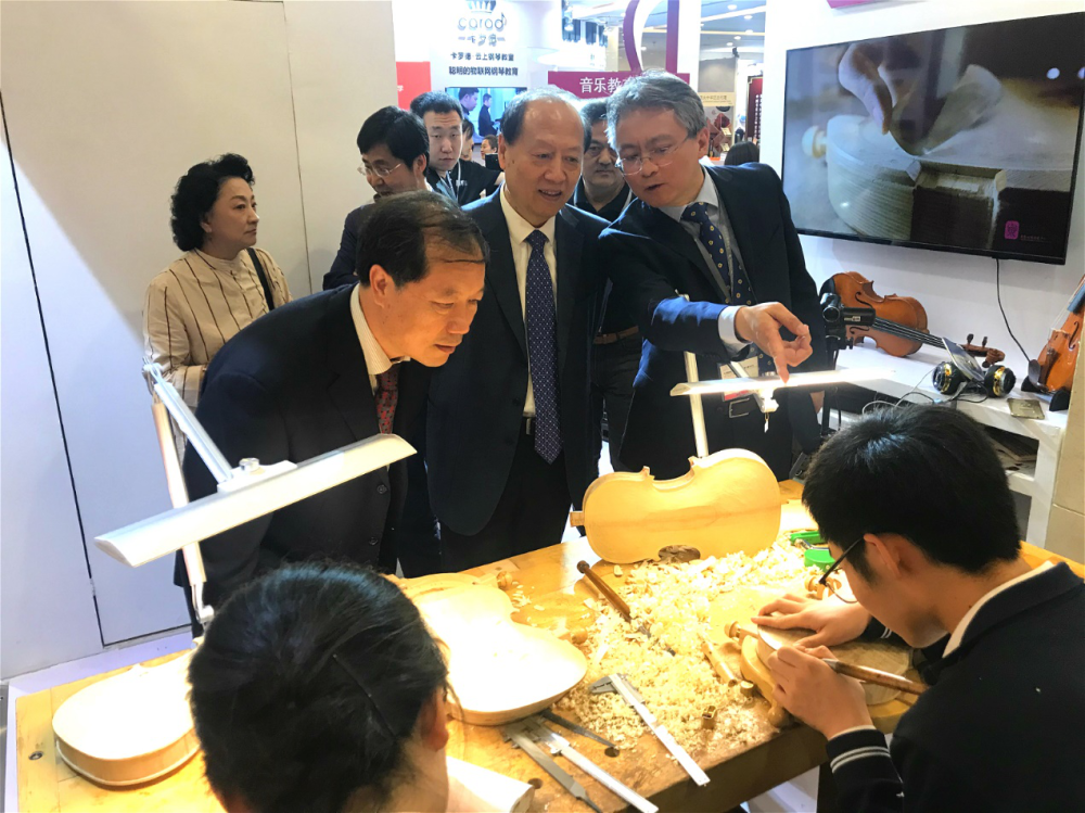 下午13时许,中国乐器协会理事长王世成、星空彩票ios版中心版党委书记赵旻来到提琴制作与研究中心版块驻足参观,由中心副主任高彤彤为两位领导讲解,两位领导对本次活动的策划方案给予了高度的赞赏。