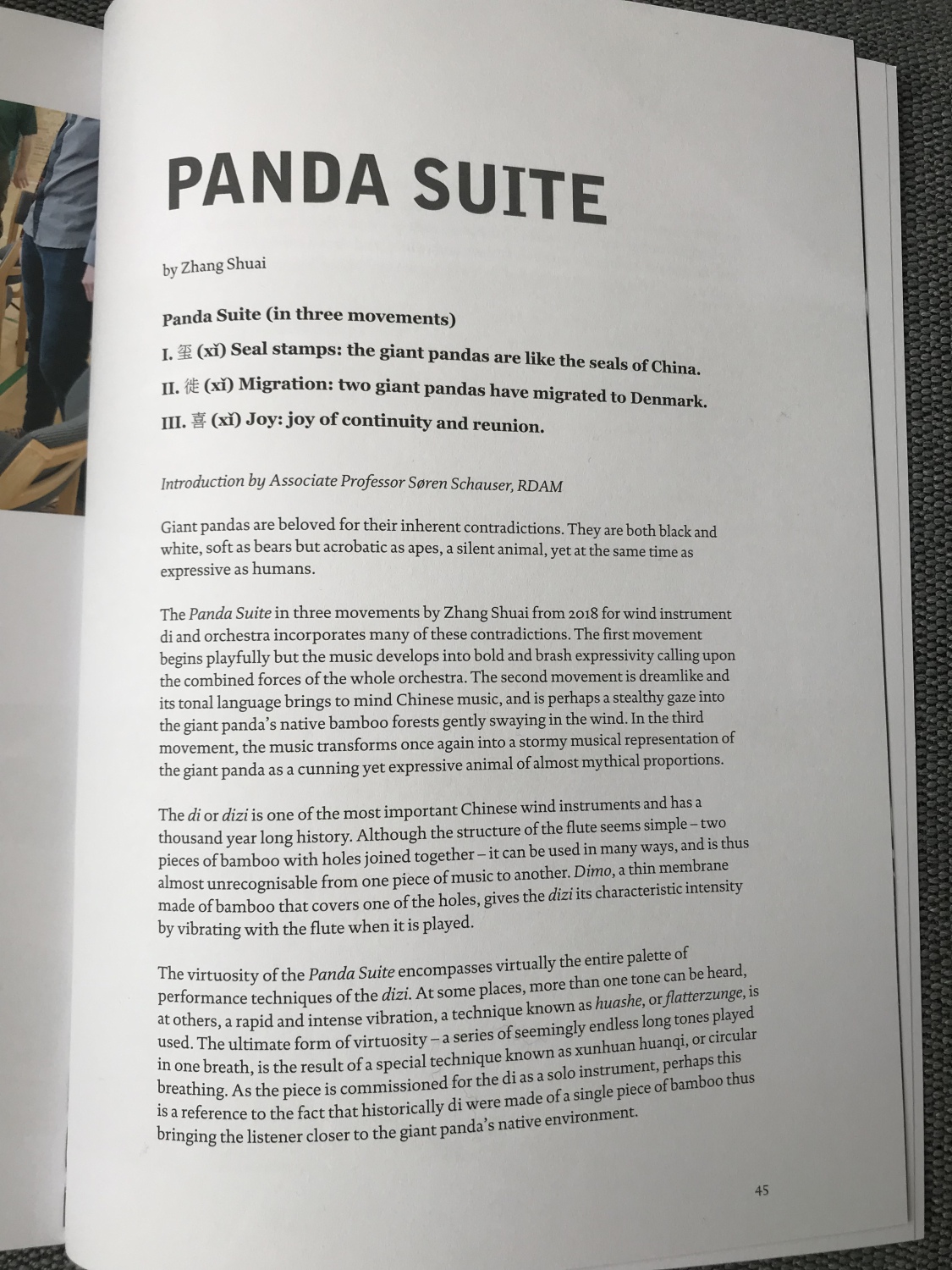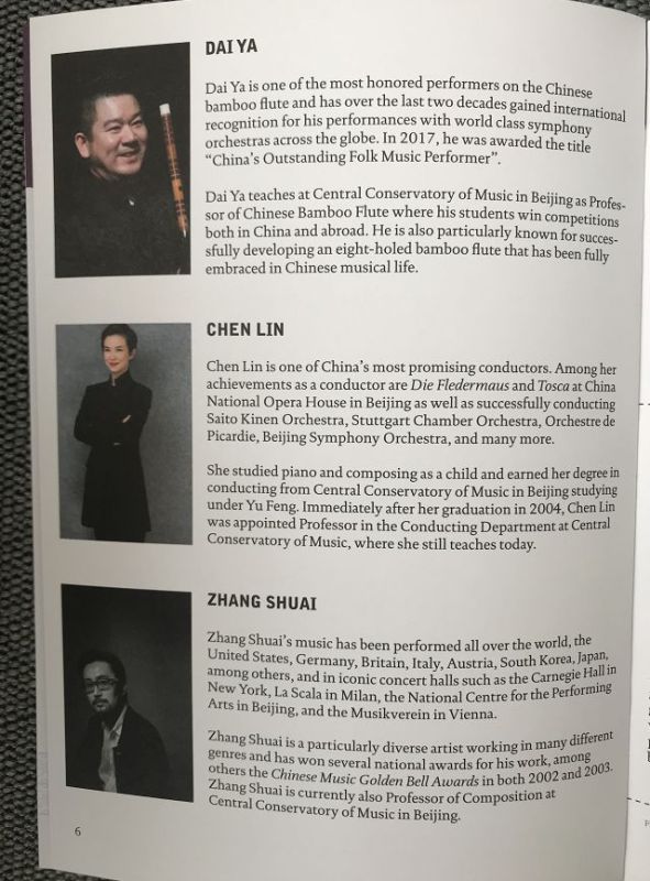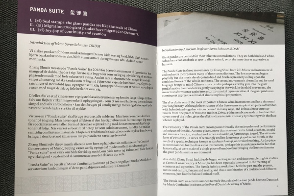 A:丹麦皇家音乐学院的音乐学教授Soren Schauser 为熊猫组曲写了一个乐曲简介,我之前不认识这个人,是MCI邀请他写的。估计他听了小样或排练后写了这篇简介印制在宣传册和节目单上。我看完觉得很有意思。他从来没和我沟通过,仅仅凭借听音乐和一些基本的背景资料,他写出了非常美的文章,充满了他对这个作品的理解和想象。我感觉他写的简介比我写的还好。这就是音乐的魅力吧。