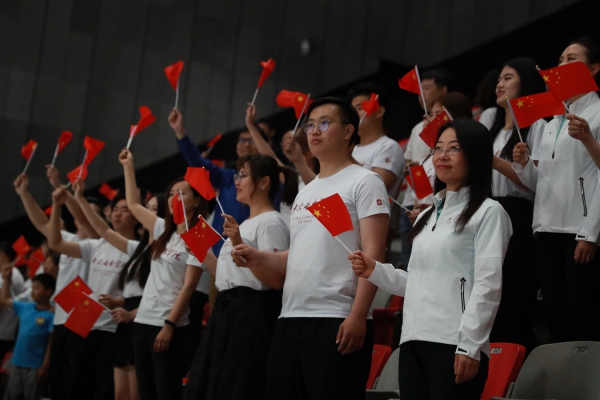 近百名师生从看台的不同入口进入,庄严却又不失优雅,为本是冰雪运动的场馆带去了些许温暖。全场的大合唱,气势如虹,将本次活动推向了高潮。