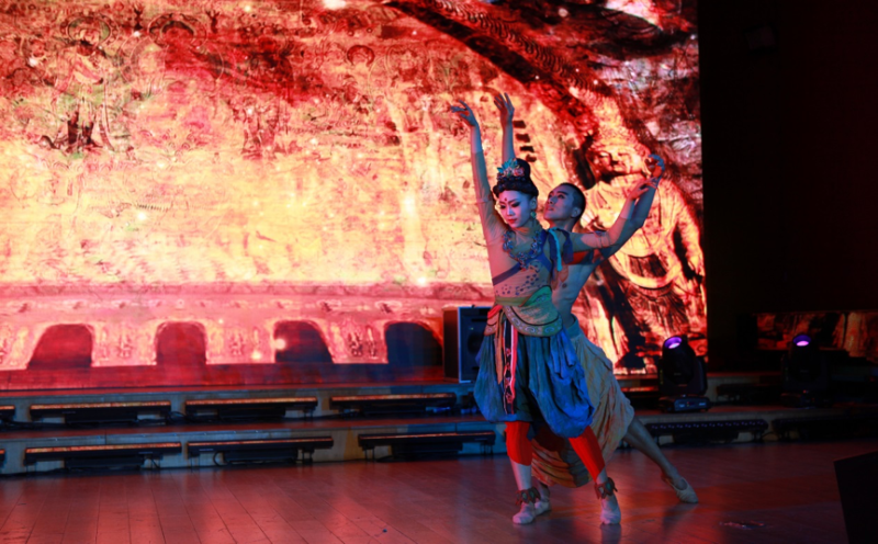 第七首《一叶菩提》也是青年作曲家关鹏创作,菩提一叶却包容万象,二胡一把却独具意境,舞者一人旋转跳跃间却将西魏壁画上的飞天羽人形象诠释得淋漓尽致,双臂双脚奋力伸展,在大千宇宙的怀抱中尽显阳刚,以形传神,道不出具体的韵味。二胡与舞者刚柔并济,电子音乐与若隐若现的壁画背景为二者创造出万物共生的空间感,流露出中国传统文化的智慧与内涵。