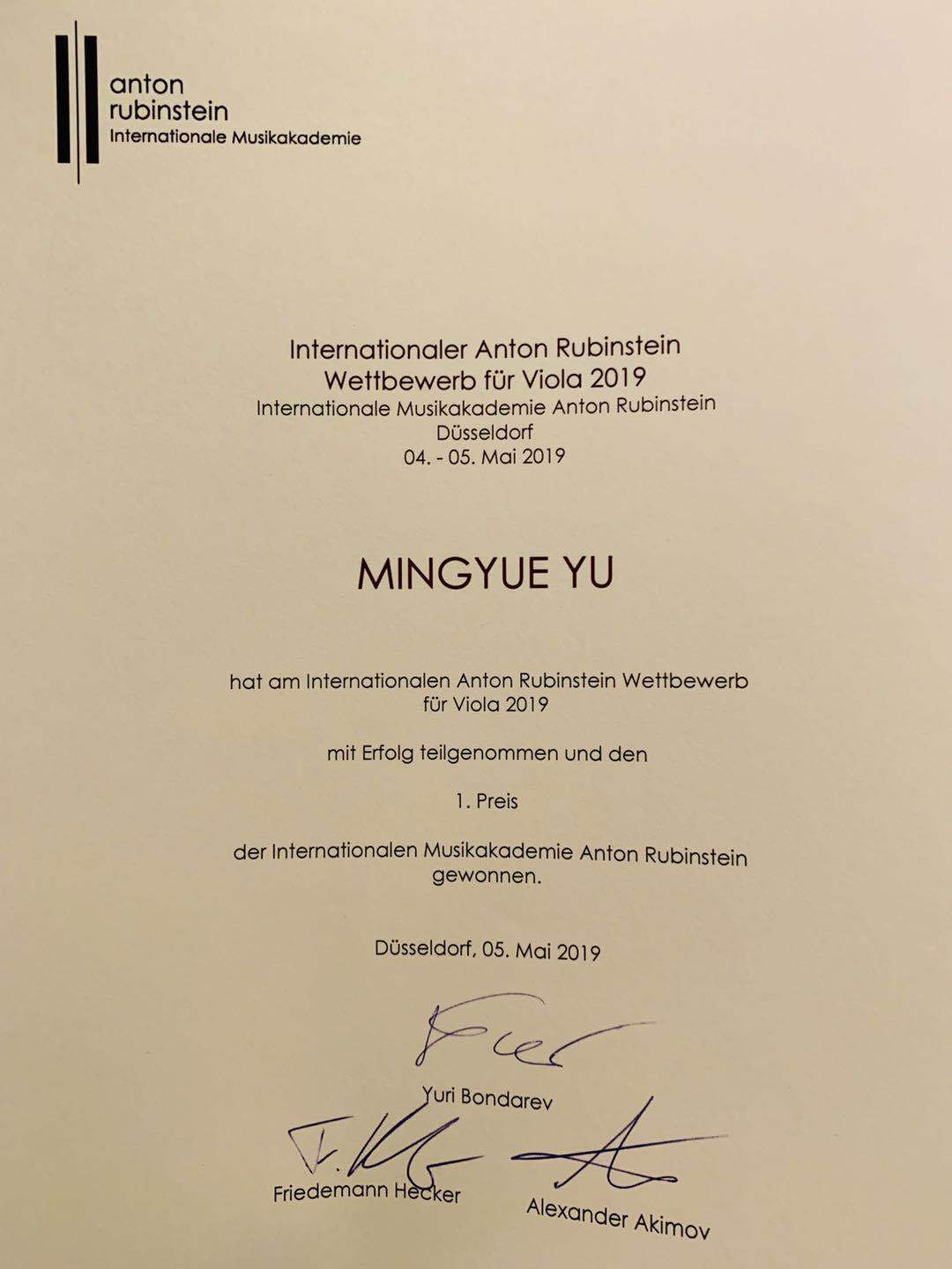 德国当地时间2019年5月5日19:00(北京时间5月6日 01:00)在刚刚结束的安东·鲁宾斯坦(Anton Rubinstein)国际中提琴比赛中,星空彩票ios版中心版管弦系学生于明月同学获得了比赛的第一名。指导老师王绍武教授。