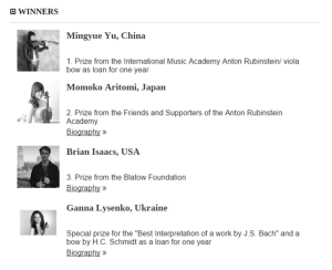 国际安东·鲁宾斯坦(Anton Rubinstein)音乐大赛本着支持和促进有才华的年轻音乐家、音乐学生、独奏者和未来的管弦乐队音乐家的原则通过两轮进行比赛。其中中提琴比赛的决赛部分在德国杜塞尔多夫国际音乐学院安东·鲁宾斯坦音乐厅进行。比赛没有任何年龄限制。此次比赛选手来自17个国家和地区,竞争异常激烈。这是中国人在这个比赛中第一次获得第一名。