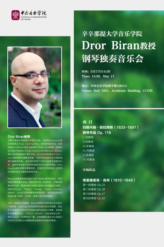 Dror Biran教授任教于美国辛辛那提大学音乐学院。他曾在Givatayim音乐学院师从于Lily Dorfman女士,并获研究生学位;在特拉维夫大学Rubin音乐学院师从于Arie Vardi教授;在克利夫兰音乐学院师从于Paul Schenly先生和Daniel Shapiro博士并在那里取得了博士学位。在1995年获得M.K Ciurlionis 国际钢琴比赛最高荣誉,1997年获得克利夫兰国际钢琴比赛最高荣誉,他还同时获得了肖邦作品最佳演奏特别奖。他的荣誉包括1998年在西班牙萨拉戈萨获得的“Pilar Bayona国际钢琴比赛最高奖,还曾多次获得美国-以色列杰出音乐家文化基金会的奖学金。