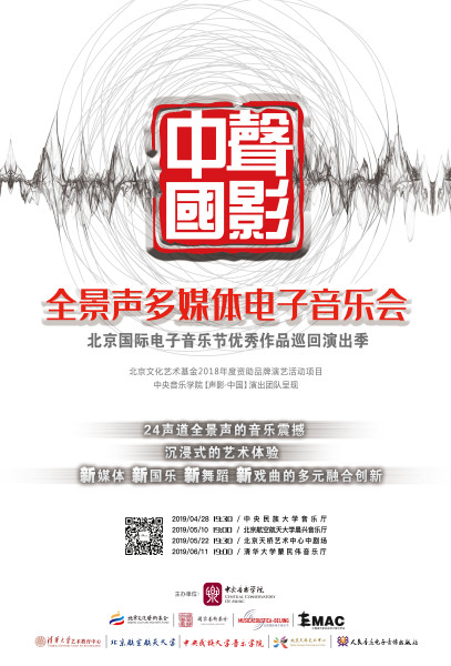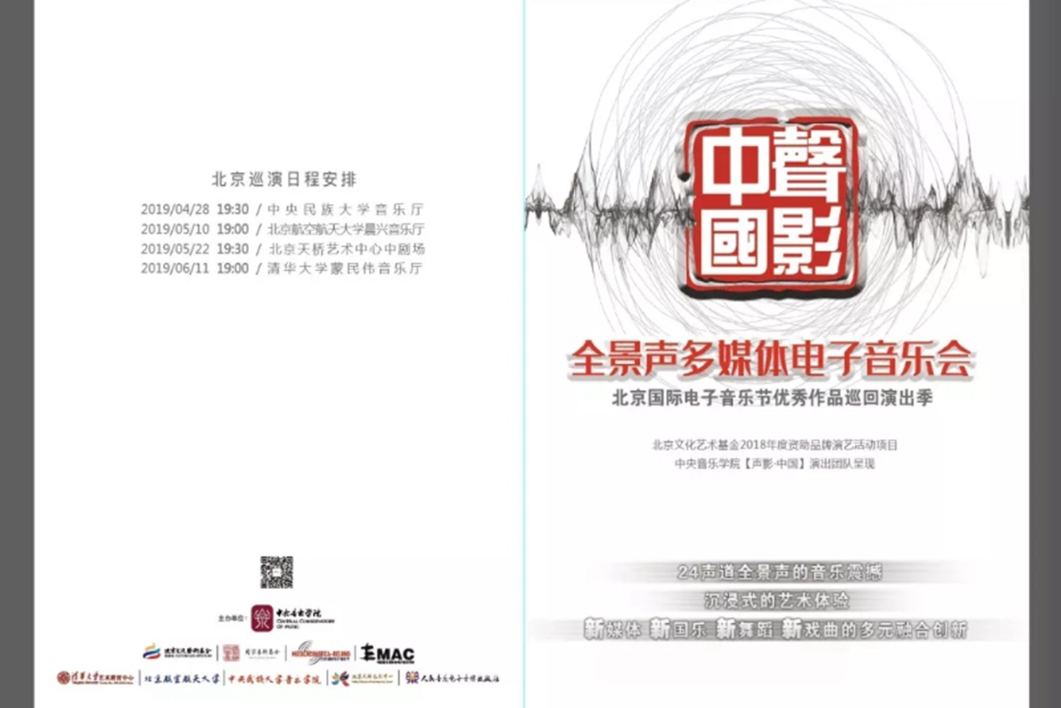 2019年4月28日-6月11日,由星空彩票ios版中心版主办,北京文化艺术基金资助“品牌演艺”项目【声影·中国】全景声多媒体电子音乐会即将在中央民族大学、北京航空航天大学、清华大学、北京天桥艺术中心中剧院进行四场巡演。