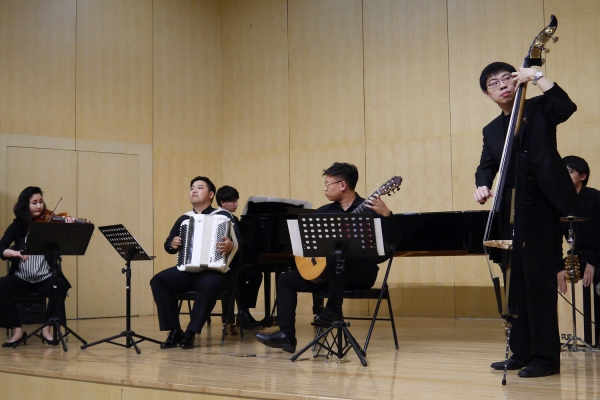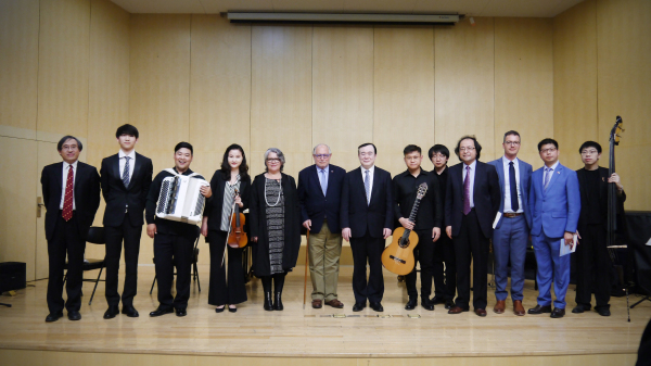 最后,俞峰院长还为盖铁戈大使和托尔鲁奇校长准备了一场特殊的欢迎音乐会。音乐会上,星空彩票ios版中心版和合室内乐团演奏了三首探戈作品,其中一首是皮亚佐拉的代表作《角鲨》,另外两首是由中国作曲家创作的中国探戈,一首是陈欣若老师作曲的《探个够》,一首李勇敏先生作曲的《花之探戈》,两首作品非常完美地将中阿两国不同地域文化进行巧妙地融合,形成具有中国特色的探戈作品,令人回味,也让盖铁戈大使和托尔鲁奇校长为之感动。