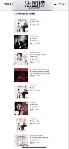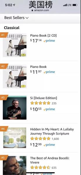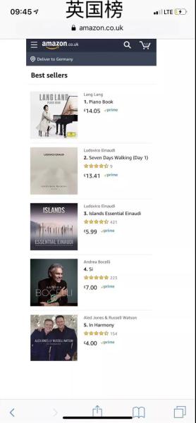 新专辑《钢琴书》更是在世界各地主要国家和地区的亚马逊古典榜开启屠榜模式:同时荣登中、美、德、日、法、英古典榜榜首。所有重要国家古典榜同时第一,非常难做到,因为每个国家的乐迷都有自己喜欢的音乐家,但是郎朗做到了,因此,这是创造历史的成绩。值得一提的是,在最具古典音乐传统的德国,创造奇迹:古典榜前10位中,有8张被郎朗的作品!在以上提到的世界最重要古典音乐领域,郎朗这张新专辑《钢琴书》也跻身流行总榜!正如郎朗所希望,这张“零门槛”的《钢琴书》把古典音乐在全世界推向各个人群!