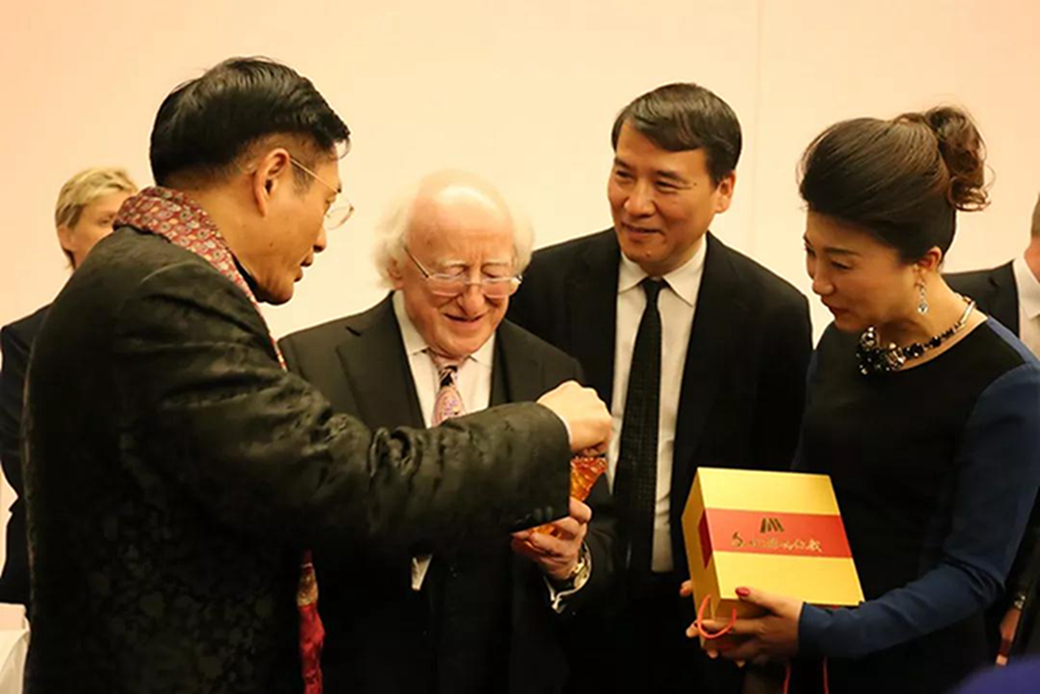 音乐会前,爱尔兰总统希金斯同中国驻爱尔兰大使岳晓勇、作曲家叶小纲教授、北京演艺集团总经理助理董宁亲切交流。
