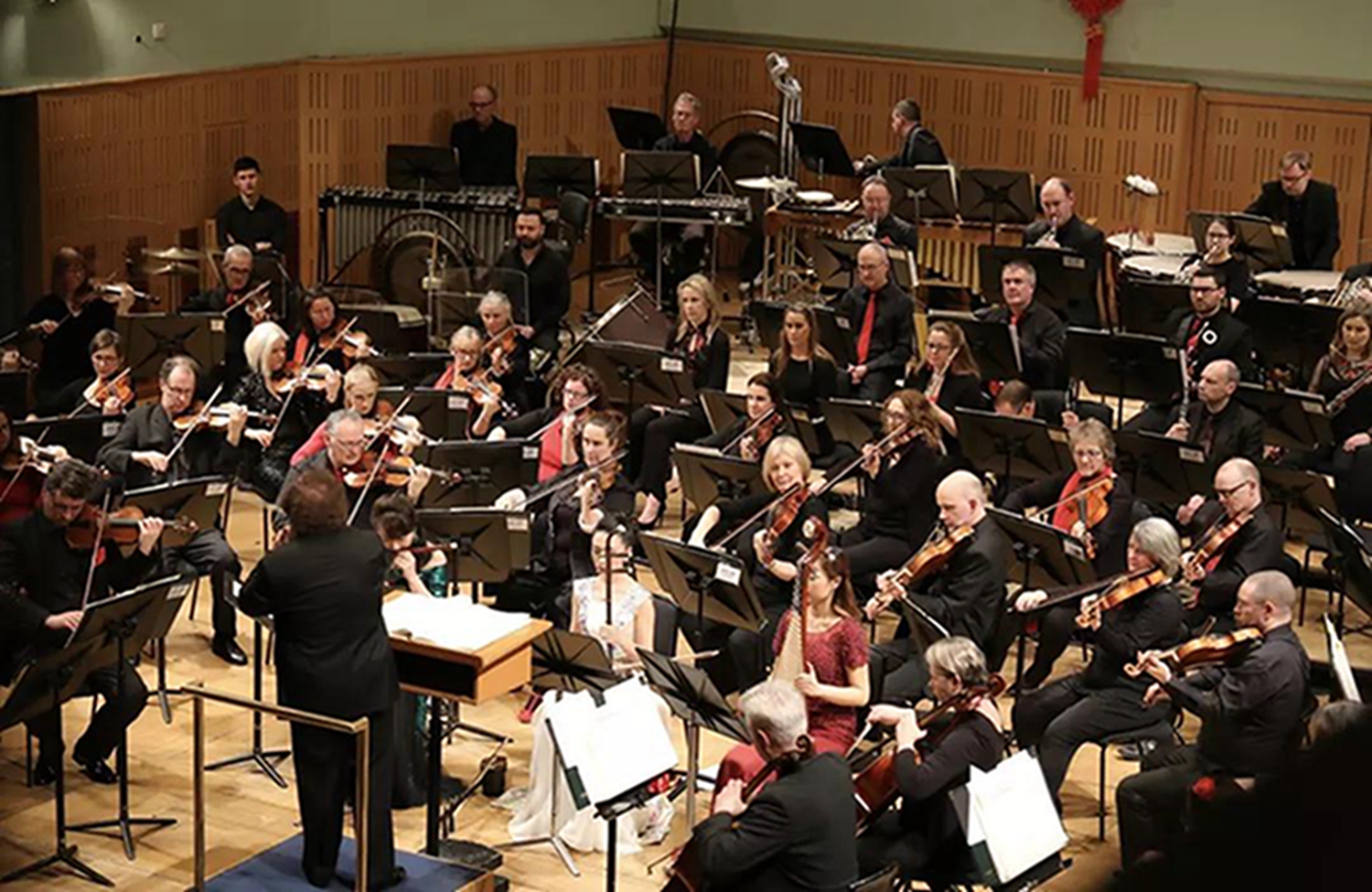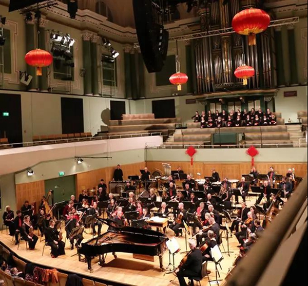 当晚,爱尔兰国家音乐厅内张灯结彩,舞台上方和背景板上分别悬挂着4个巨大的红色灯笼和两个鲜红的中国结,在灯光的照耀下格外醒目。