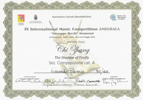 2019年5月,张驰的另外一首钢琴作品《The Shadow of Firefly》(耀影)获得了第9届阿米加拉国际音乐比赛作曲A组(独奏乐器组,无年龄限制)二等奖。这项比赛是在意大利举办的每年一度的国际性音乐比赛,得到当地政府和很多音乐家的大力支持。