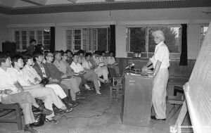1983年9月,国际知名民族音乐学家、美国马里兰大学教授胡德来校讲学,第一排听众左8为俞人豪