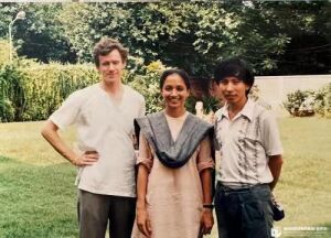 1986年安平(右1)在印度新德里艺术中心(Shriram Bharatiya Kala Kendra)校园,与印度著名婆罗多舞舞蹈家里拉-萨姆森老师和其美国弟子合影
