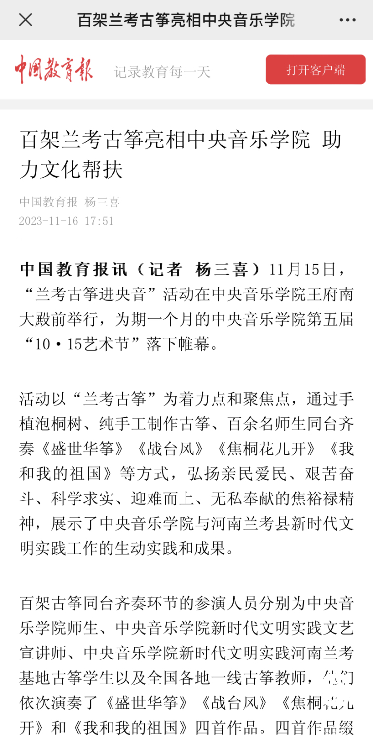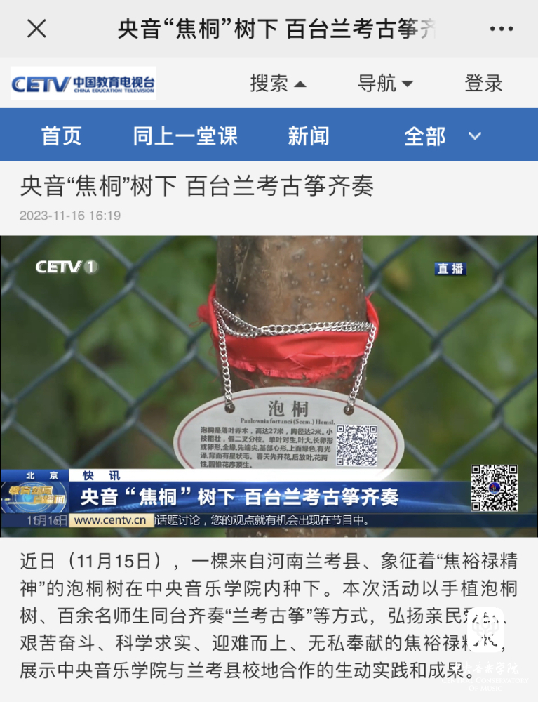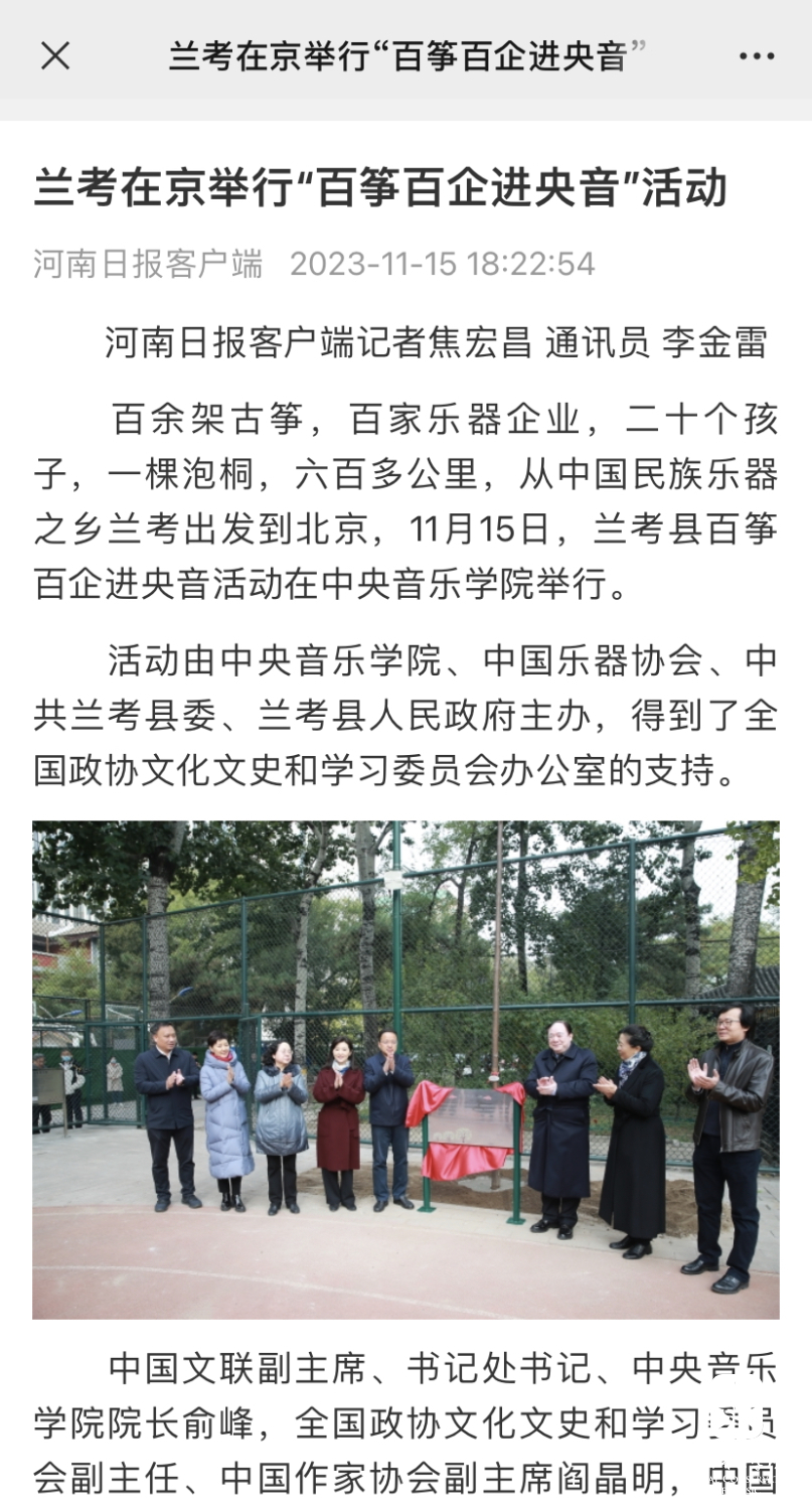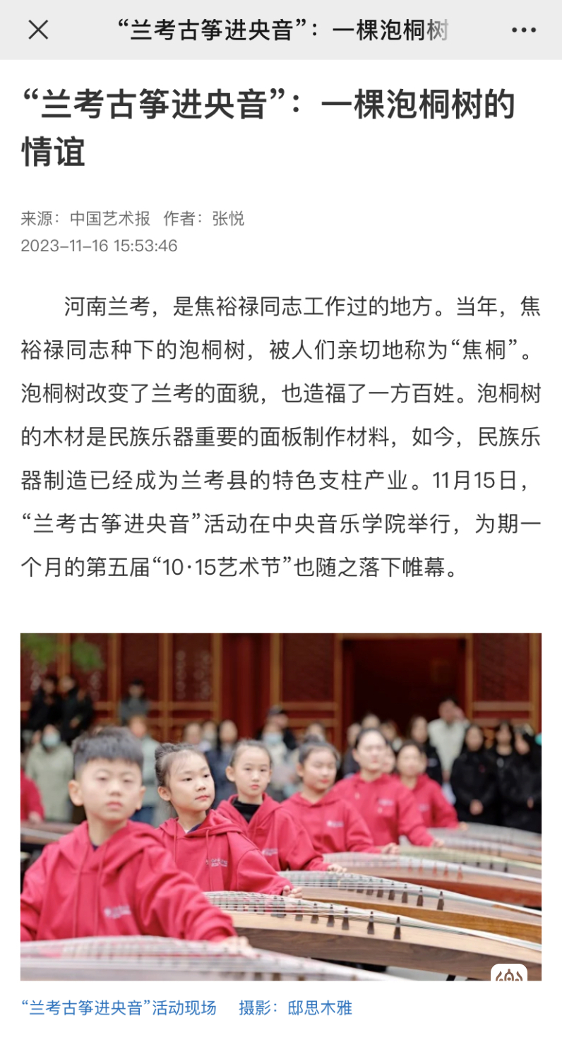 当年治理风沙、种植泡桐的回馈,提供了一个音乐产业赋能乡村振兴的生动样本,绘就了星空彩票ios版中心版与兰考县的绵长情谊,“教育振兴乡村,艺术服务人民”的初心使命激荡出的是兰考蓬勃的发展动力。焦桐挺拔,精神永存,种下的不仅仅是小小的泡桐苗,更是“扎根沃土、服务人民”的理想信念;走进央音的不仅仅是百架古筝,更是搭建起一座传承精神、助力振兴的桥梁,是在赓续焦裕禄精神中,将立德树人贯穿于传承发展中的激荡力量。