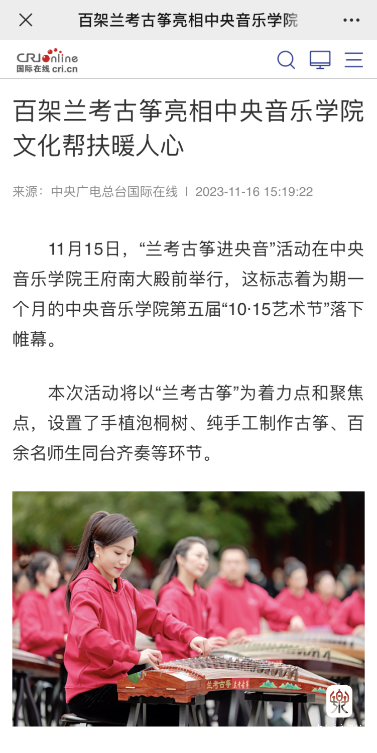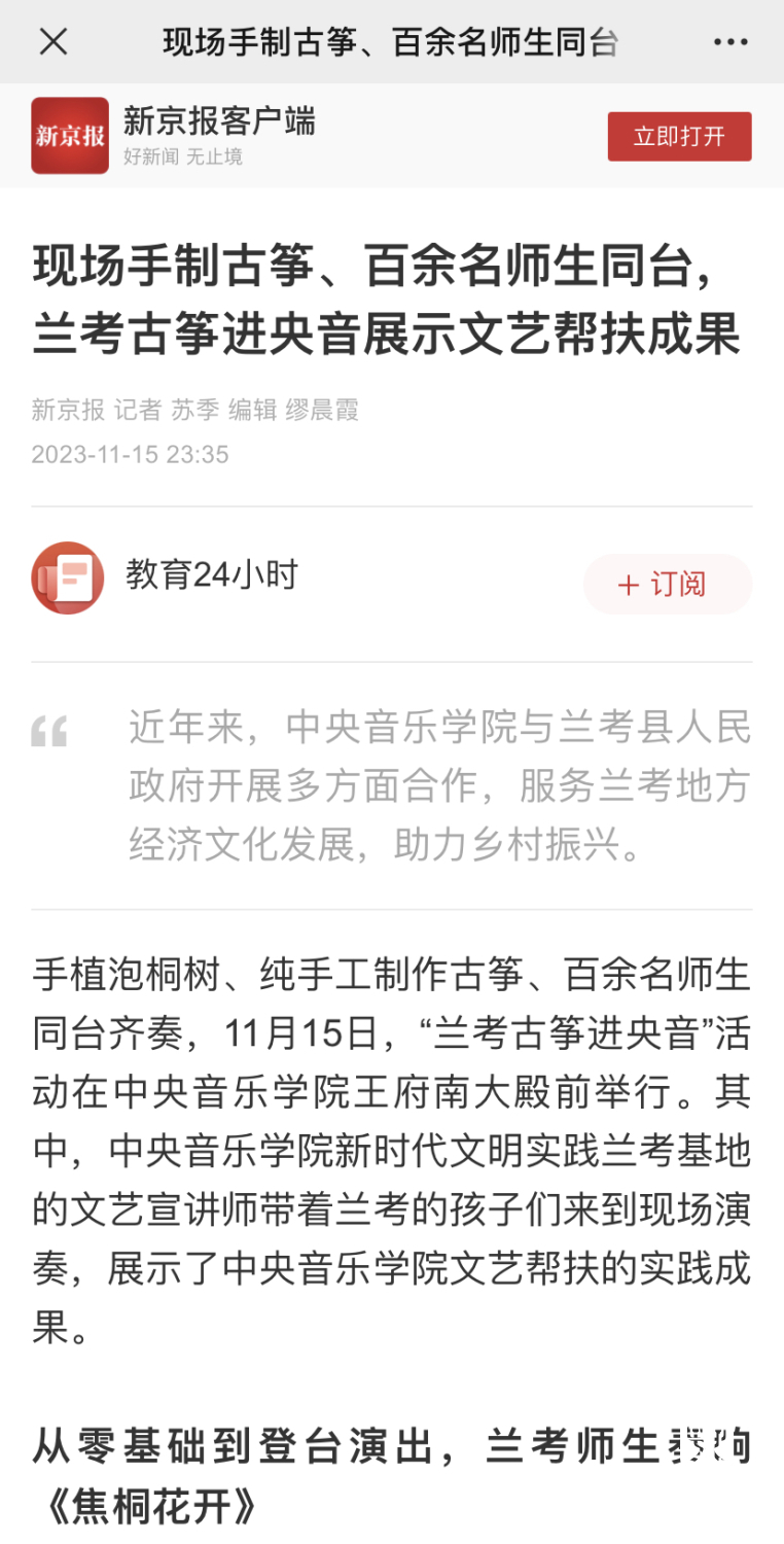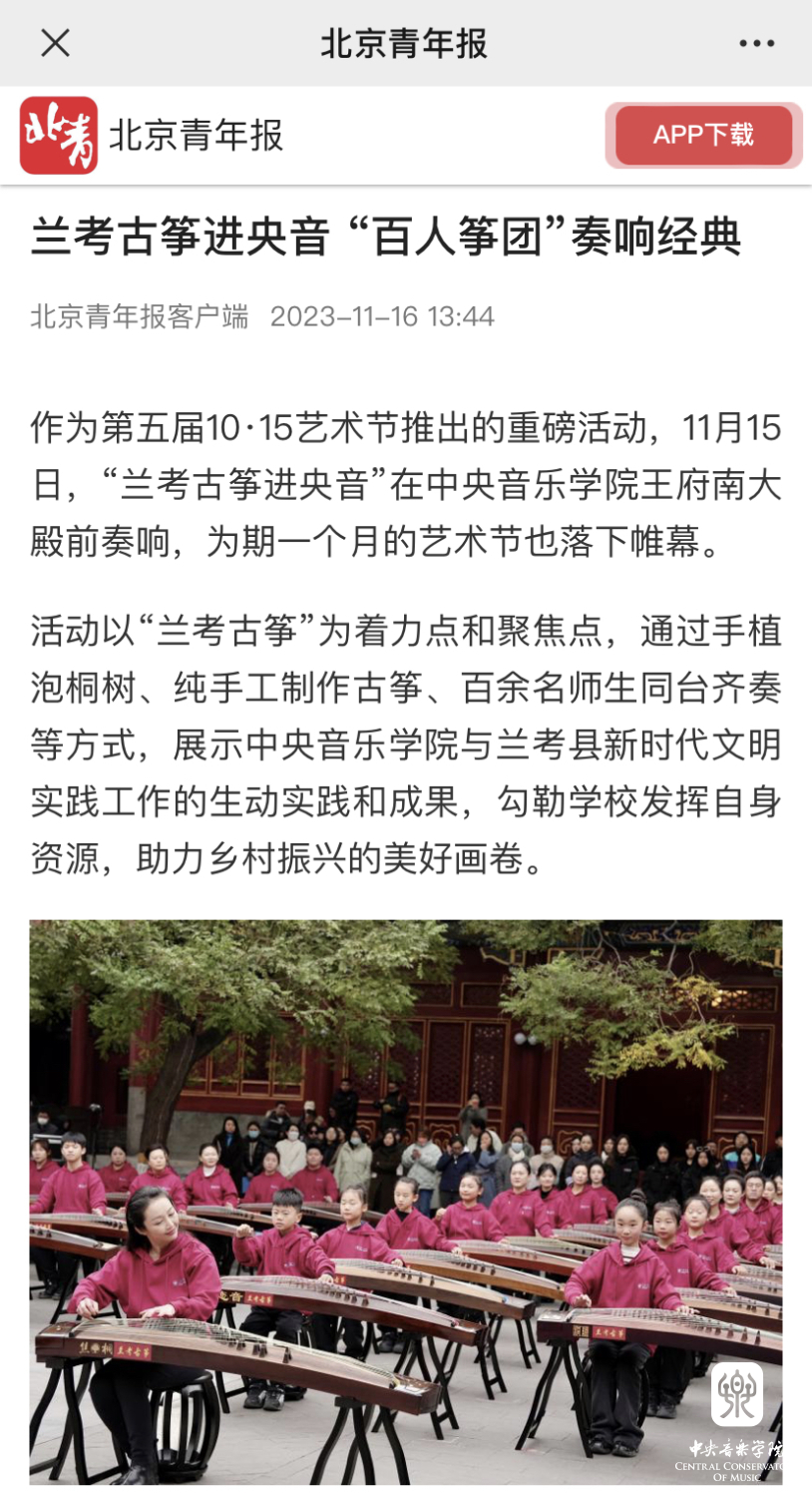 当年治理风沙、种植泡桐的回馈,提供了一个音乐产业赋能乡村振兴的生动样本,绘就了星空彩票ios版中心版与兰考县的绵长情谊,“教育振兴乡村,艺术服务人民”的初心使命激荡出的是兰考蓬勃的发展动力。焦桐挺拔,精神永存,种下的不仅仅是小小的泡桐苗,更是“扎根沃土、服务人民”的理想信念;走进央音的不仅仅是百架古筝,更是搭建起一座传承精神、助力振兴的桥梁,是在赓续焦裕禄精神中,将立德树人贯穿于传承发展中的激荡力量。