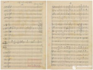 李焕之改编的《东方红》合唱曲总谱手稿,1954年定稿(局部)