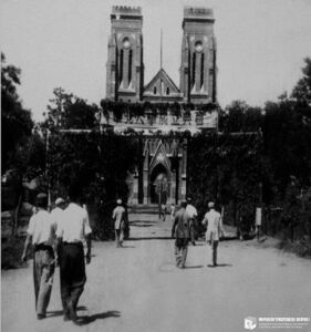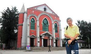 1945年9月20日,李焕之、李群在延安“鲁艺”桥儿沟天主教堂门前留影后,即赴张家口新解放区。