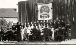 下,1941年秋,桥儿沟教堂前,李焕之指挥排练大合唱《凤凰涅槃》