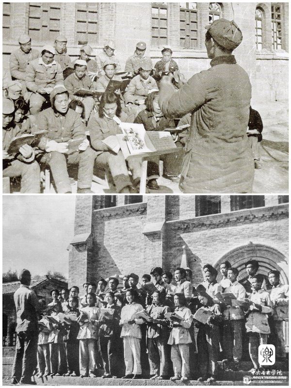 上,1940年初,桥儿沟教堂外,李焕之给“鲁艺”音乐系学员上合唱课