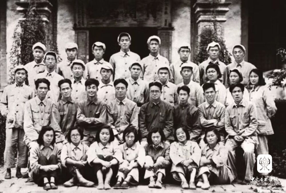 1948年9月,“华大”三部(文艺学院)领导与音乐科第二班师生合影。第一排(坐地):左1李群;第二排左起:林里、李一鸣、李元庆、艾青、沙可夫、李焕之、周巍峙、张鲁。