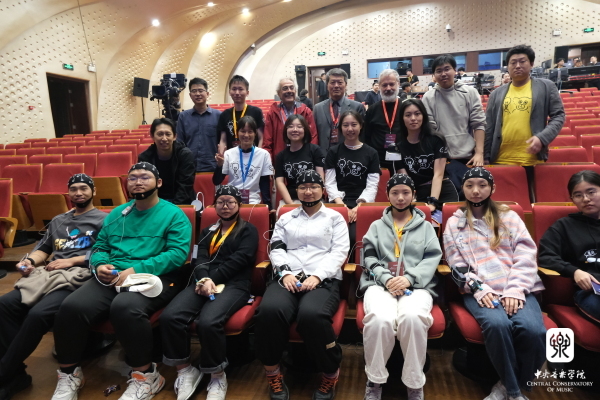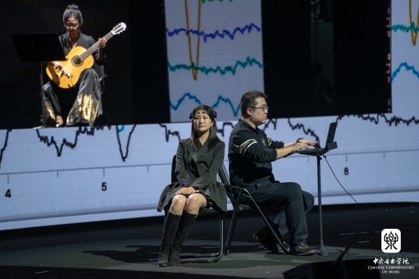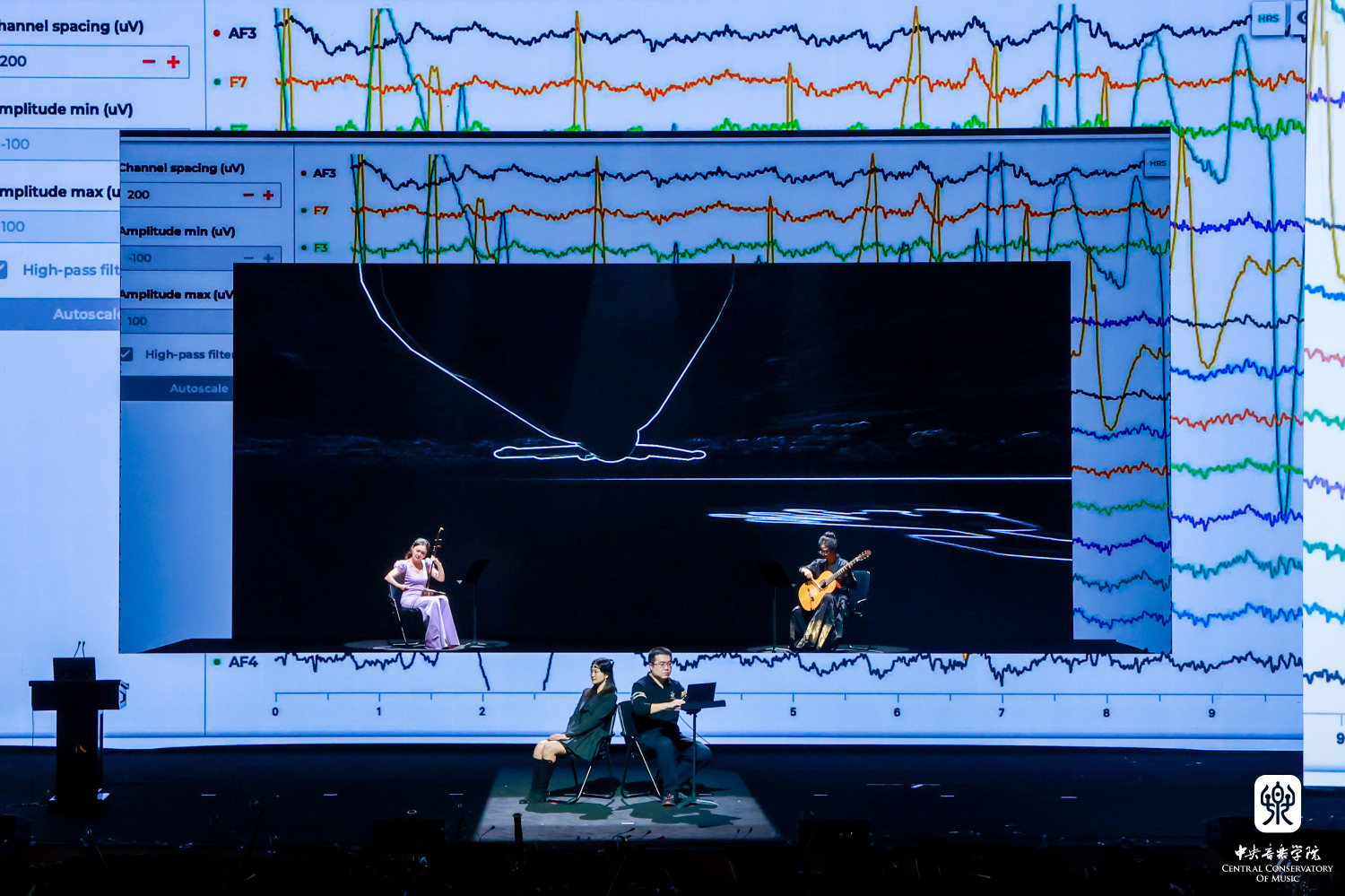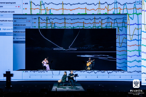 音乐会进行中,王小勤教授带领央音音乐与脑科学实验室团队在现场开展了一次实景音乐脑科学实验,实验团队由星空彩票ios版中心版与清华大学脑与智能实验室合作建立。团队邀请了6位受试者作为观众,实时记录并展示受试者在观赏现场表演时的脑电和生理数据,并将在后续实验中对数据进行分析。