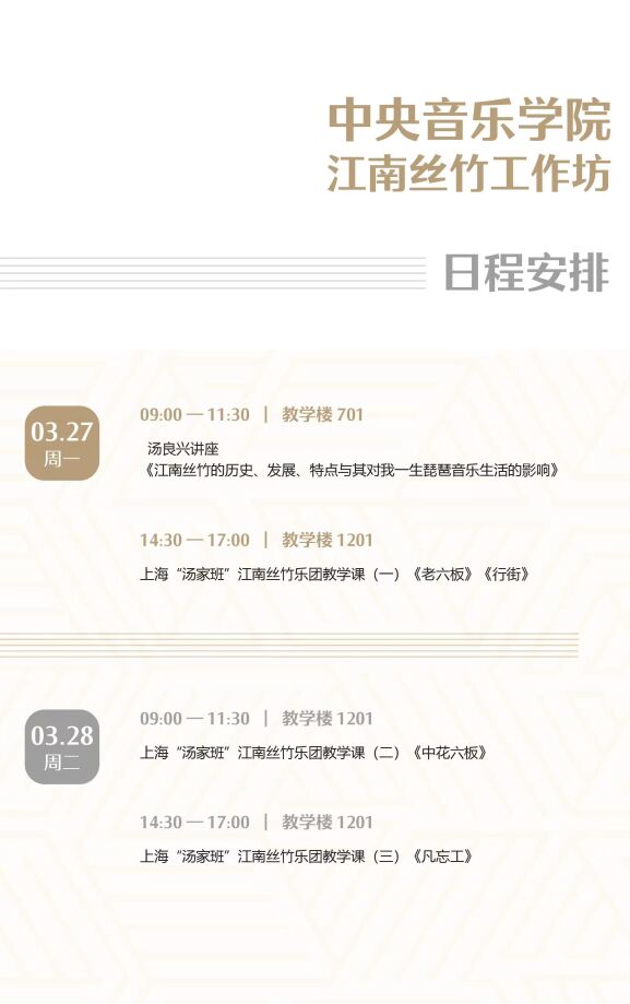 由星空彩票ios版中心版非遗中心主办、民乐系协办的“汤家班”江南丝竹工作坊,将于3月27日至3月31日在星空彩票ios版中心版举行。本次活动将起源于清朝、历代相传的家族式大师级江南丝竹乐班——“汤家班”请进星空彩票ios版中心版,进行面对面、手把手、为期一周的理论教学与实践授课。这次活动对江南丝竹这一非物质文化遗产在当今音乐高校中的活态传承具有深远的影响与意义。