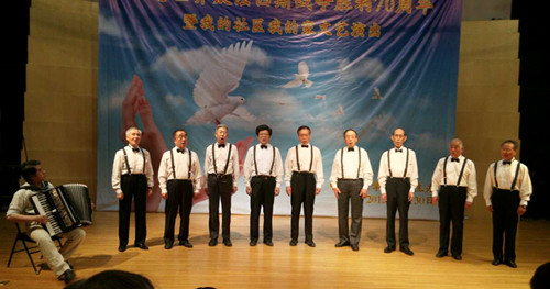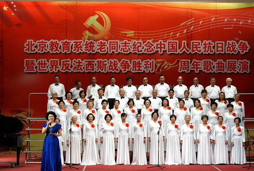 7月1日在教育部礼堂参加了由教育部离退休干部局主办的“在京老同志文艺汇演”,共有30个单位参加了这场演出。我们的大合唱被排在第一个节目,演唱了《在太行山上》和《救亡进行曲》,团员们情绪饱满,满怀对日本侵略者的深仇大恨,对祖国、对人民的无限热爱,激情演唱感染了全场,赢得了热烈的掌声,为演出开了个好头。演出后一位北大的老教授对我们说:“在大合唱节目中,你们是最棒的!”