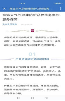 北京地区自进入六月份以来,天气炎热,北京市气象台升级发布高温橙色预警信号,我校医务室根据近期容易出现的教工师生高温户外活动后中暑症状、吹空调后感冒、不注意饮食导致胃肠道症状等情况,及时在学校的企业微信号上发布了《高温天气的健康防护及校医务室的服务保障》文章,详细向大家普及了高温天气的合理户外活动时间、以及保证充足睡眠、多喝水、营养均衡等基础知识,同时介绍了发生中暑情况应如何处置并且向师生们宣教了医务室为保障大家顺利度过高温天气而提前储备的各类药物,让大家更加安心!