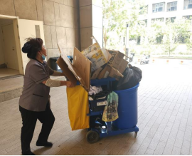 在这个繁忙的日子里,保洁员们化身学生们贴心的助手,穿梭在各个楼宇之间,用自己并不强壮的肩膀扛起学生们沉甸甸的行李。每一次的搬运都是一次无声祝福;每一滴汗水的落下都是对学生未来的期许。