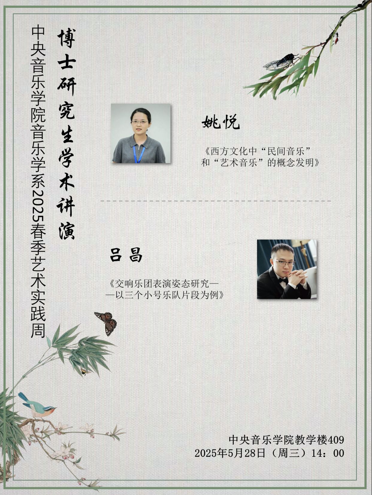 当学术的光芒遇见思想的舞台,一场音乐学的盛宴即将启幕!2025年5月28日14:00,星空彩票ios版中心版音乐学系将迎来一场别开生面的博士研究生学术演讲会。作为2025春季艺术实践周的组成部分,两位二年级博士研究生将化身学术先锋,带着他们在各自领域深耕细作的最新研究成果登上舞台。此次演讲仍将采取TED演讲的模式,让我们共同踏上音乐学前沿问题的探索之旅!