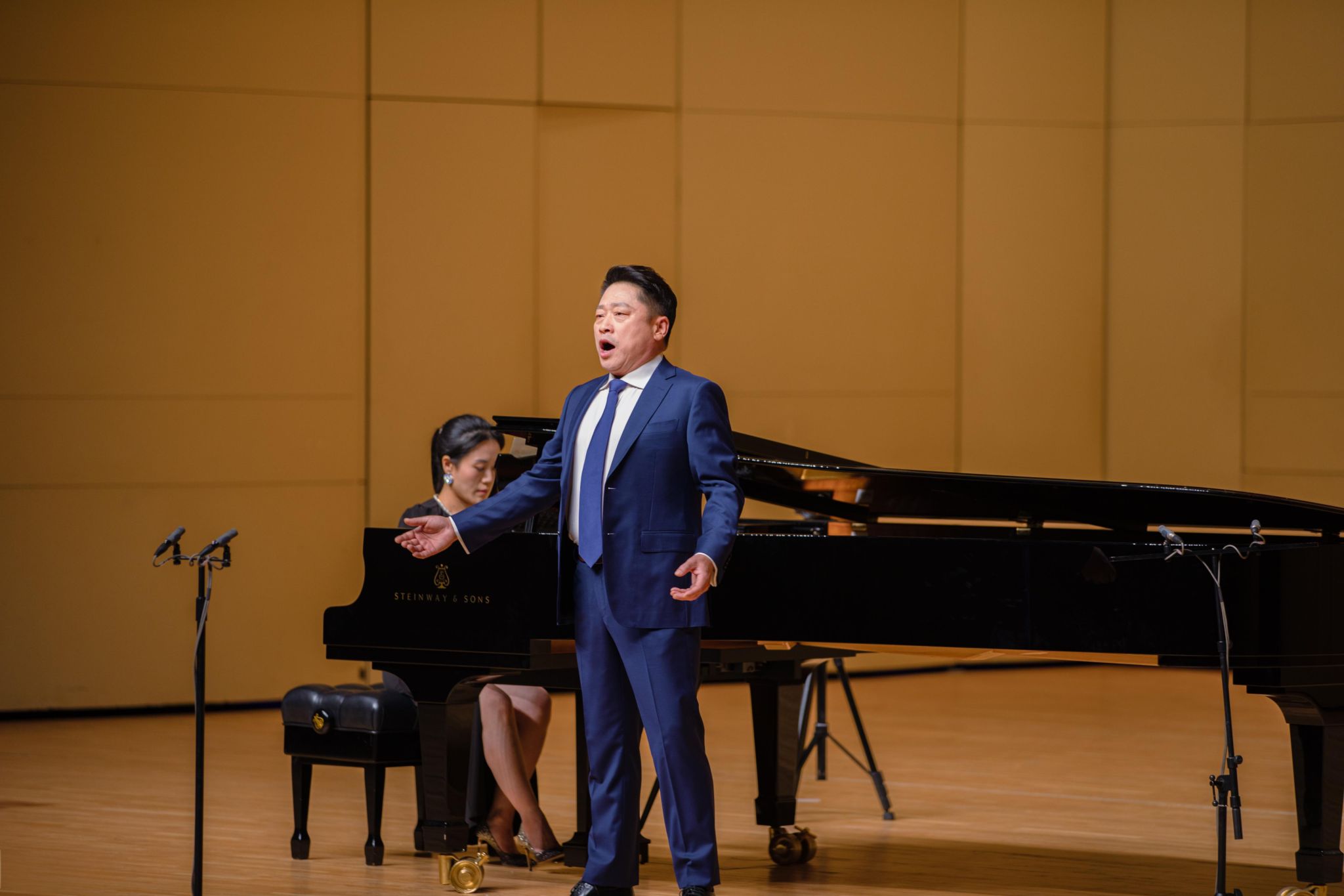 上半场,观众们还沉浸在诉说和温情的歌声中,仿佛将观众带入到那个激情燃烧的岁月。下半场一开始,张文巍老师就以其浑厚磁性的男低音完美演绎《我的祖国妈妈》,将现场氛围烘托到新的高度,随后又一经典的爱国歌曲《我爱你中国》由袁晨星老师演唱,华美的嗓音、真挚的情感和流淌的旋律交织在一起,对祖国的无限感激与深沉热爱依稀可见。