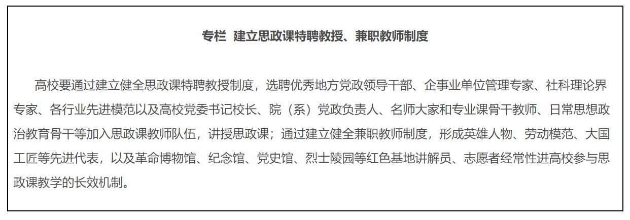 14.建设专兼结合的师资队伍。各地各校严格按照要求配备建强高校专职思政课教师、辅导员队伍,提高中小学专职思政课教师比例,实行思政课特聘教授、兼职教师制度,积极聘请党政领导、科学家、老同志、先进模范等担任思政课兼职教师。深入实施马克思主义学院院长(书记)培养工程,通过集中培养培训、委托重大项目、加强实践锻炼、开展国际国内访学等方式,培养一批青年马克思主义理论家。