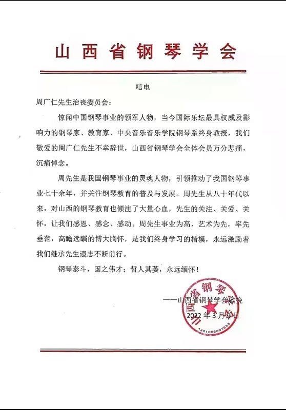 山西省钢琴学会致唁电 悼念周广仁先生