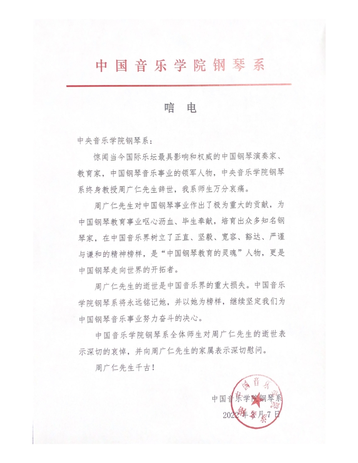 中国音乐学院钢琴系致唁电 悼念周广仁先生