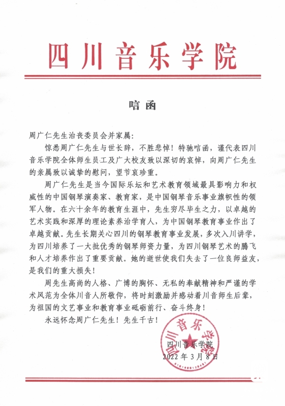 四川音乐学院致唁函 悼念周广仁先生