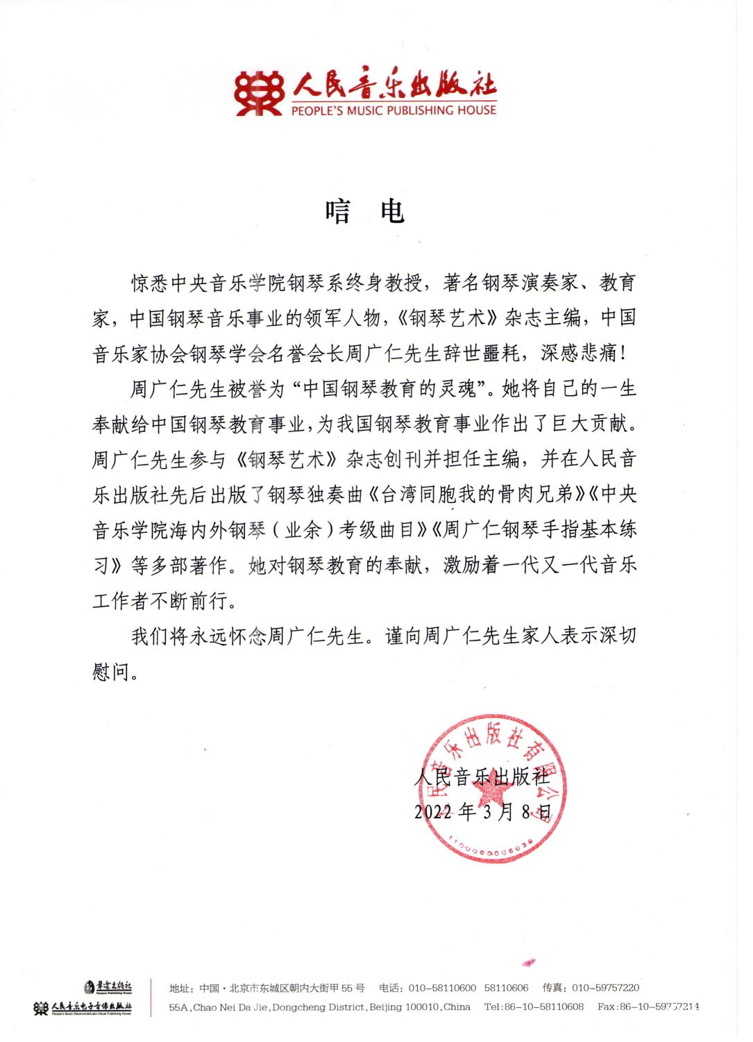 人民音乐出版社致唁电 悼念周广仁先生