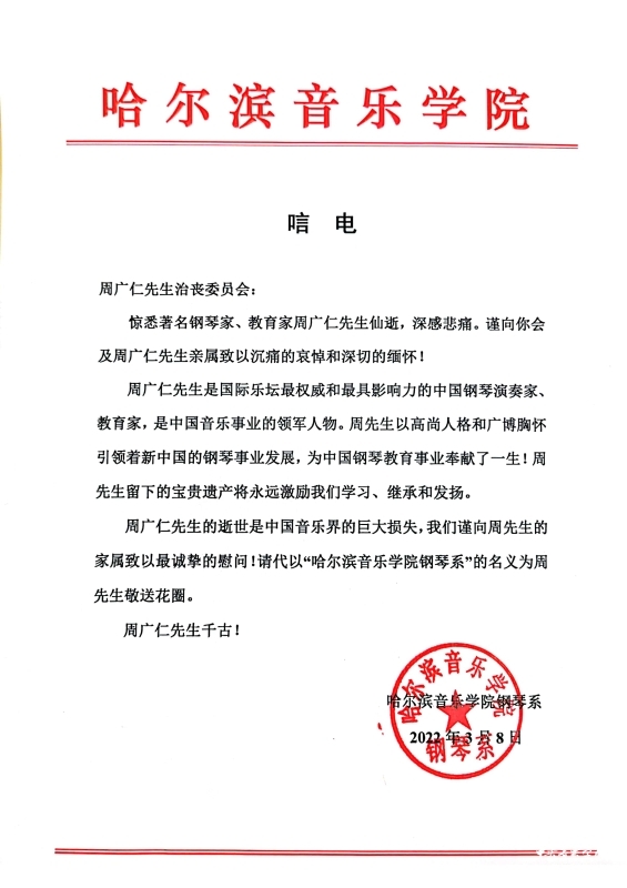哈尔滨音乐学院钢琴系致唁电 悼念周广仁先生