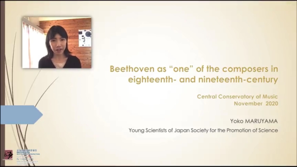 Yoko Maruyama, Ph.D. in Musicology, Aesthetics and Science of Arts at Keio University in Tokyo, Ph.D. in Musicology at the University of Vienna, Research Fellowships for Young Scientists of Japan Society for the Promotion of Science, a part-time instructor at Keio University in Tokyo. She is a scholarship holder of the OeAD (Austrian Agency for International Cooperation in Education and Research (2012-2014), the Rohm Music Foundation (2014-2016) and the Dissertation Completion Fellowship of the University of Vienna (2016-2017). Her research focuses on Beethoven's compositional style and its relationship with his contemporary composers and social contexts. Her research interests also extend to arrangements of original works, interaction between compositional style and acoustics or development of musical instruments. Her current scholarly activities include presentations at various conferences both within and outside Japan.