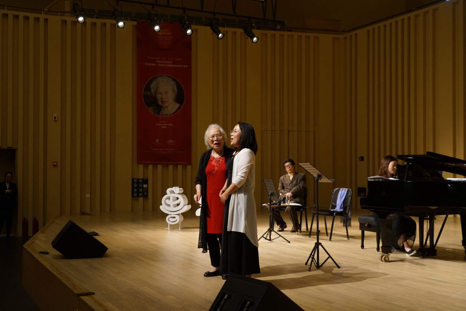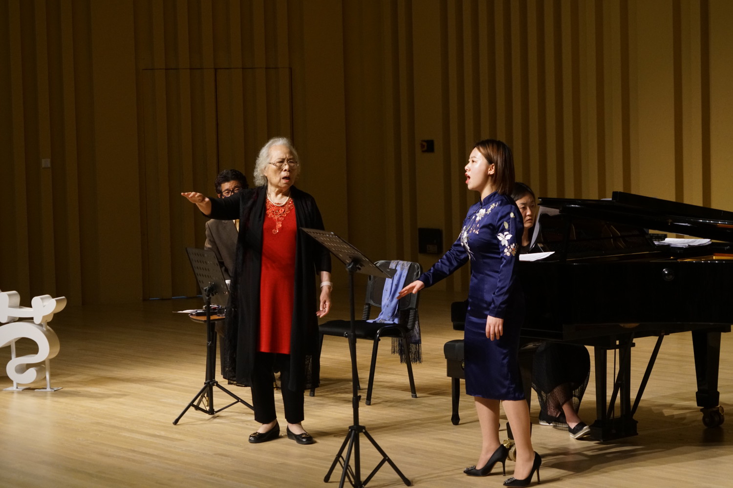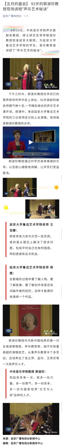 92岁高龄的郭淑珍教授在长达2个多小时的授课中精神饱满,思维敏捷,始终站立教学,针对学生歌唱中出现的音乐表现力与歌唱技术方面的问题给予悉心启发与鼓励,反复示范、领唱,令人深深地感动、敬佩。