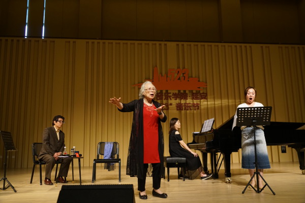 延安大学鲁迅艺术学院的青年教师杨茜、王亚娜、姚春霞分别演唱了《我爱你中国》《黄河怨》《乡音乡情》三首经典的当代艺术歌曲,钢琴作奏郭静。郭老师一一对她们进行了公开指导。