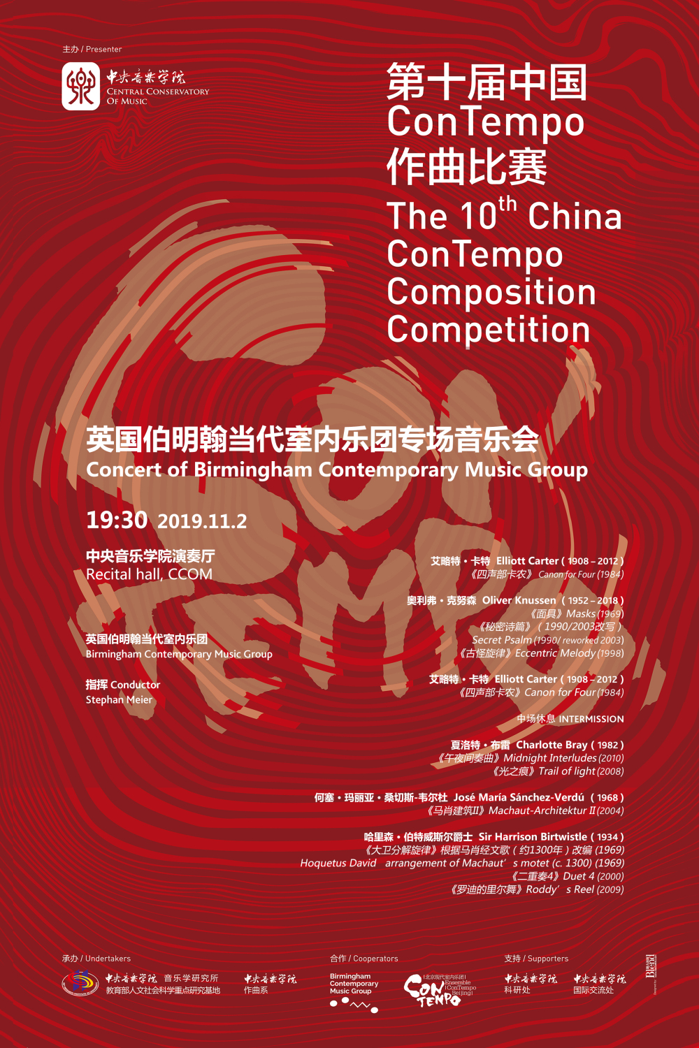 本届ConTempo作曲比赛由星空彩票ios版中心版与英国伯明翰当代室内乐团(Birminghan Contemporary Music Guoup)共同举办,面向全球35岁以下的青年作曲家征曲,参赛作品最小编制为五重奏,最大为九重奏且须同时包含中西方乐器。由中国音乐家协会主席、著名作曲家叶小纲教授担任评委会主席,星空彩票ios版中心版作曲系主任郝维亚教授、上海音乐学院作曲系主任周湘林教授、中国音乐学院作曲系主任金平教授、德国弗莱堡音乐学院Johannes Schöllhorn教授以及英国伯明翰当代室内乐团艺术总监Stephan Meier所组成的评委会,从来自中国、美国、德国等国30部参赛作品中评选出了8部获奖作品,其中一等奖1名、二等奖1名、三等奖2名和佳作奖4名。此外,在短短的四天时间里,英国伯明翰当代室内乐团联袂北京现代室内乐团(Ensemble ConTempo Beijing),为听众带来了两场精心准备的音乐会。