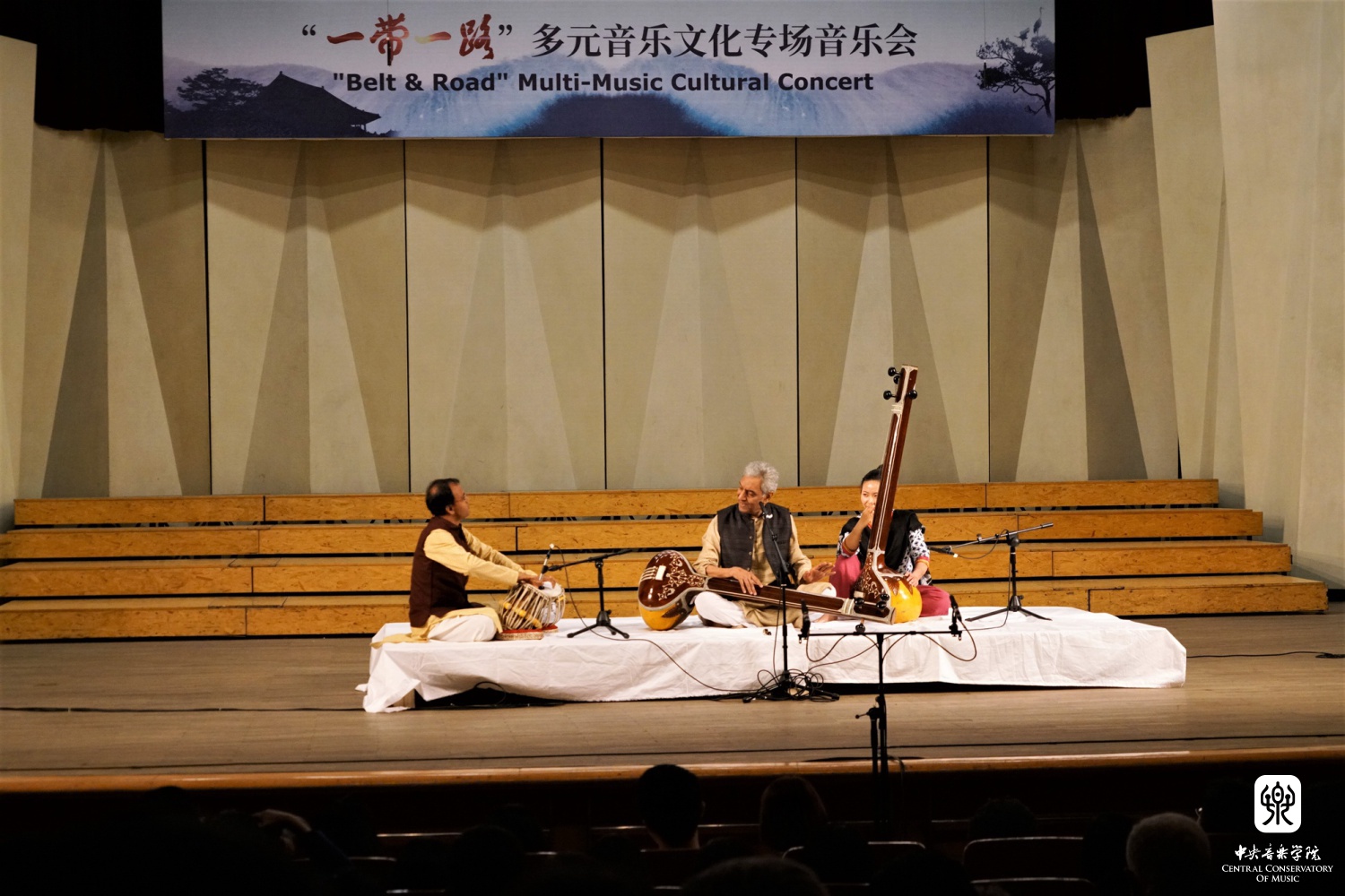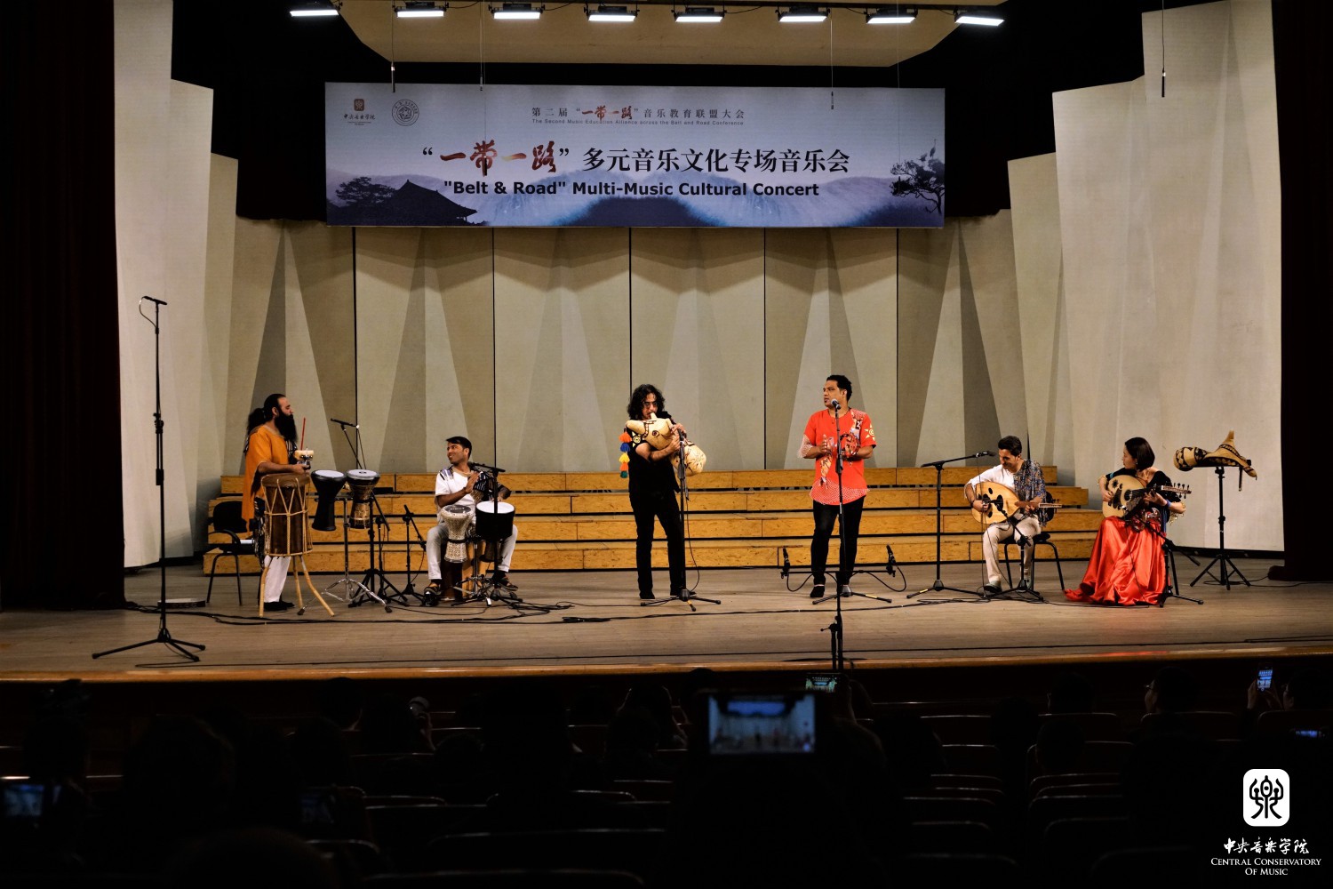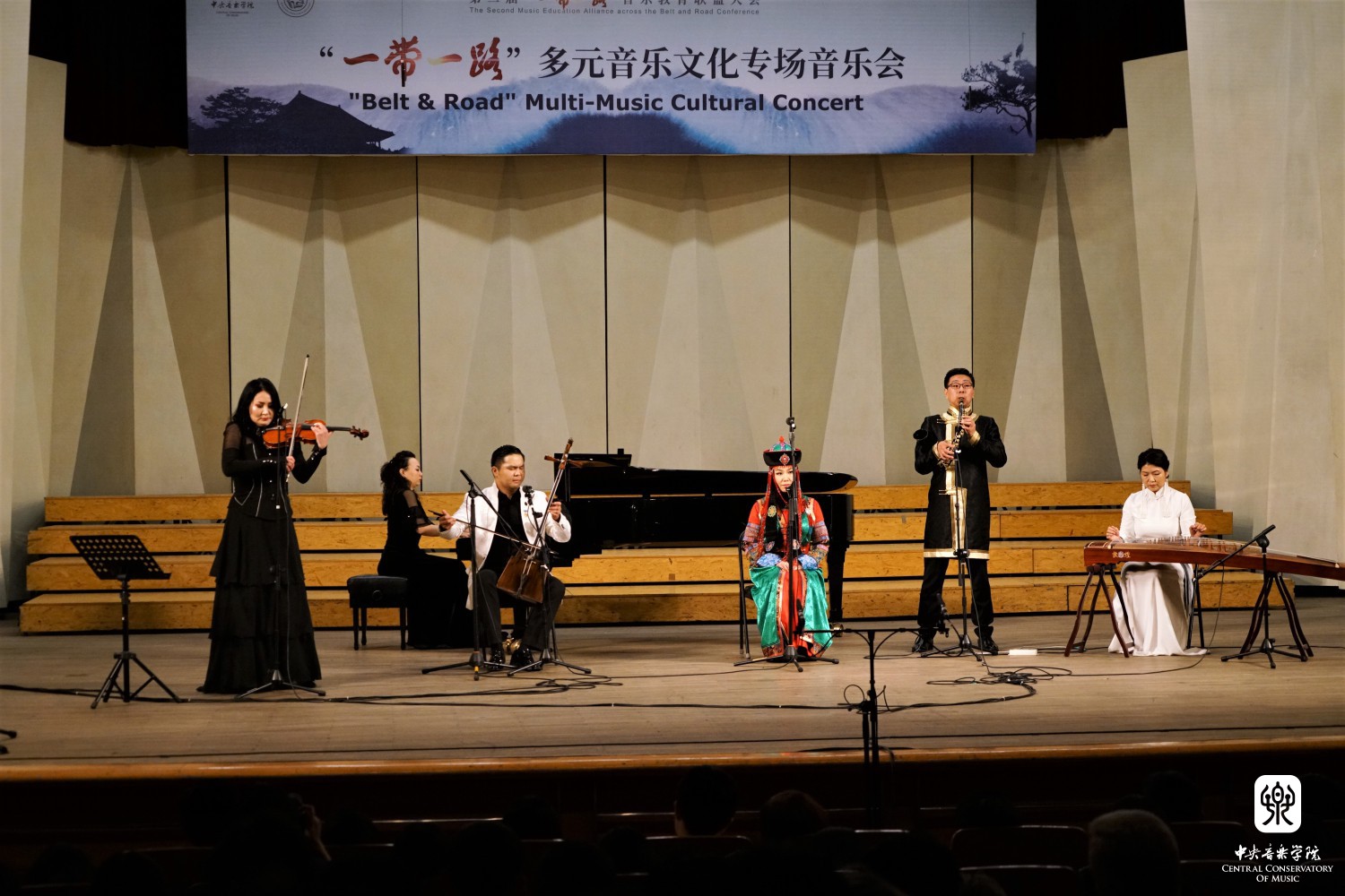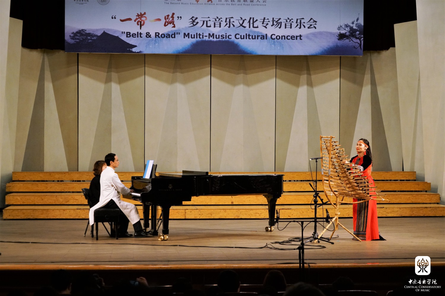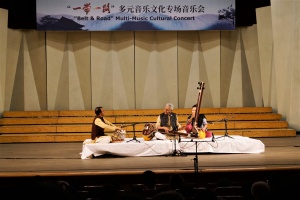 “‘一带一路’多元音乐专场音乐会”——多姿多彩的“一带一路“音乐之旅,这是本次大会闭幕演出。斯里兰卡音乐家带来传统的音乐和舞蹈《激动人心的时刻》,土耳其音乐家带来木卡姆音乐,用土耳其古典及民间乐器演奏了《先祖帕西热》等8首从17-20世纪的乐曲,全方位展示了土耳其木卡姆音乐的神韵。蒙古国音乐家带来了女生独唱、呼麦、蒙古筝与乐队、马头琴与乐队、单簧管与乐队的套曲。越南音乐家阮氏华灯博士带来了特龙琴与钢琴合作的作品《摇篮曲》和《恰尔达什》。印度音乐家带来北印度古典声乐克亚尔表演,声腔进行极为复杂。两位缅甸音乐家带来缅甸竖琴——弯琴(中国唐代称凤首箜篌)重奏和独奏表演。伊朗音乐家带来波斯湾风情组曲《海港的回忆;你属于我们;水手之歌》《难忘朋友!难说再见!》,他们热情带领观众进行互动表演,同时邀请一位中国女音乐家参加演出,将音乐会热烈的气氛推向顶点,为本次大会画上圆满的句号。