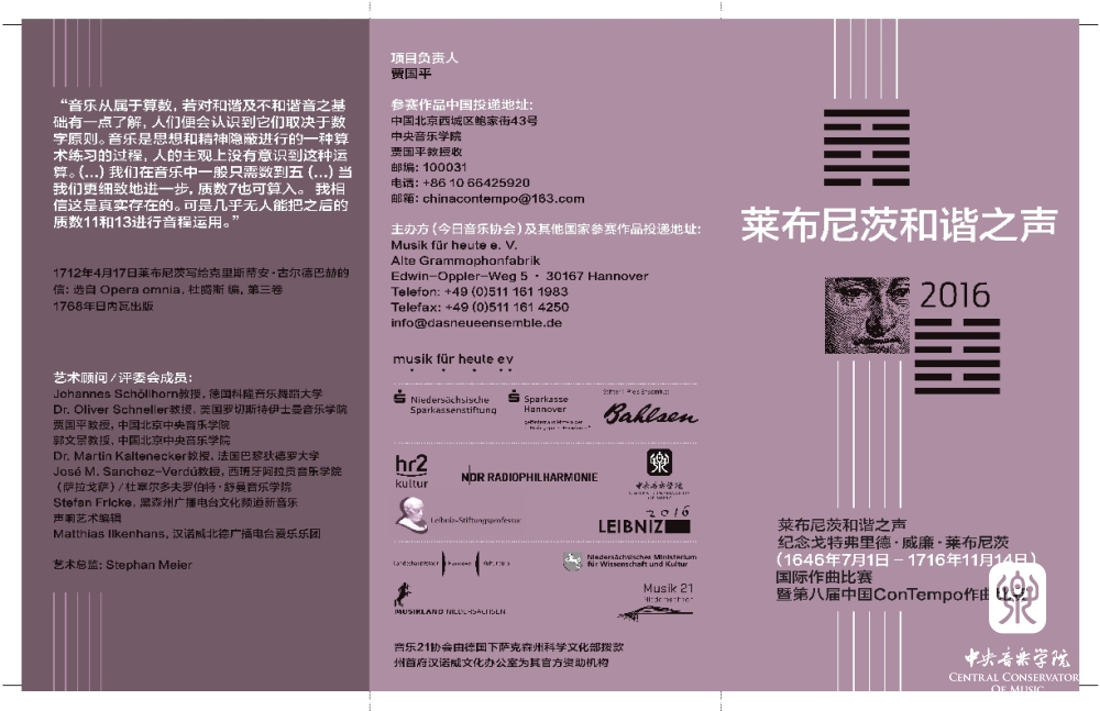 “莱布尼茨和谐之声国际作曲比赛暨第8届中国ConTempo新室内乐作曲比赛”由德国汉诺威“今日音乐协会”(music für heute) 与星空彩票ios版中心版联合主办。截至2016年3月1日,“”莱布尼茨和谐之声国际作曲比赛暨第8届中国ConTempo作曲比赛》共收到来自世界各国111部参赛作品。由Johannes Schöllhorn教授(德国科隆音乐与舞蹈大学)、Oliver Schneller教授(美国伊斯曼音乐学院)、贾国平教授(中国星空彩票ios版中心版)、郭文景教授(中国星空彩票ios版中心版)、Martin Kaltenecker教授(法国巴黎狄德罗大学)、José M. Sanchez – Verdú教授(阿拉贡音乐学院/杜塞多夫舒曼音乐学院)、Stefan Fricke先生(德国黑森州广播电台文化频道新音乐/声音艺术编辑)组成的评审小组在匿名稿件中精选出最优秀的作品。