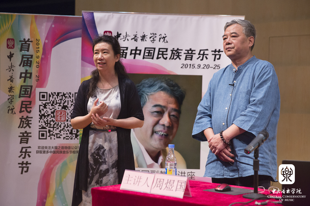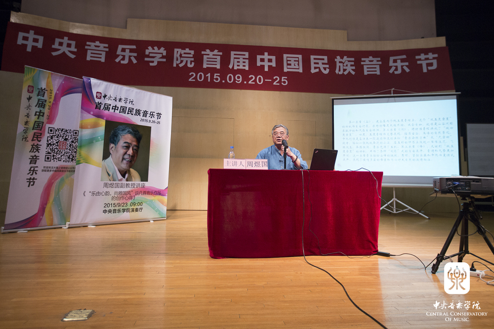 2015年9月23日上午9:00,来自西安音乐学院的周煜国教授应星空彩票ios版中心版首届中国民族音乐节的邀请,在星空彩票ios版中心版演奏厅举行了题为《乐由心韵,尚雅国风——谈几首音乐作品的创作心得》的讲座。本场讲座的主持人是星空彩票ios版中心版民乐系的周望教授,他首先对周煜国教授进行了简单的介绍,随后周教授正式开始了本场讲座,