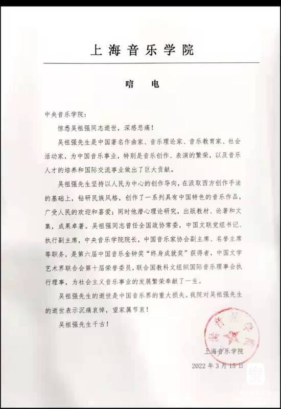 上海音乐学院致唁电 悼念吴祖强教授