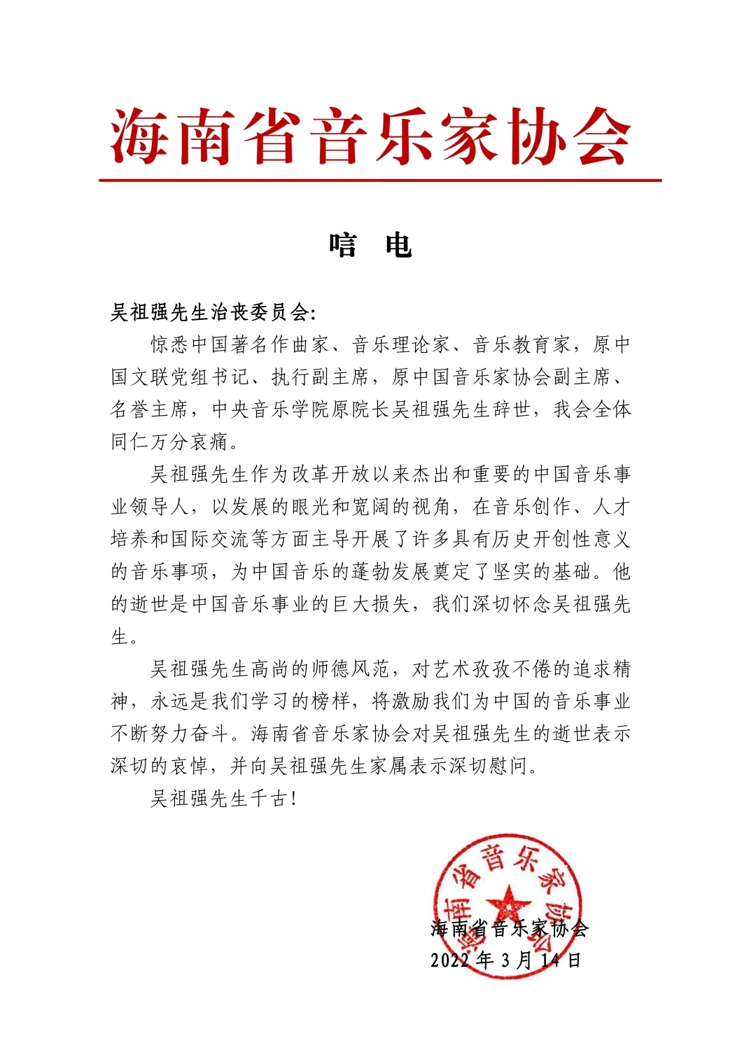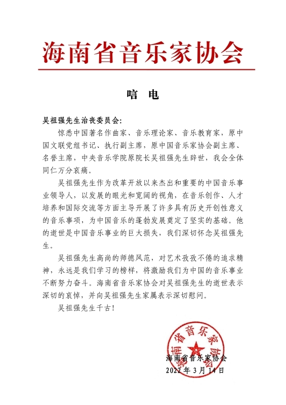 海南省音乐家协会致唁电 悼念吴祖强教授
