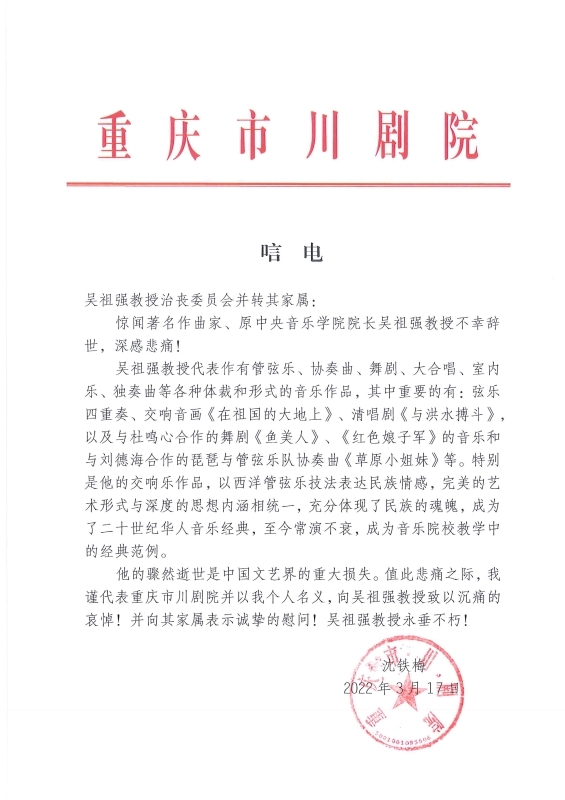 下一条:沈阳音乐学院钢琴系致唁电 悼念吴祖强教授
