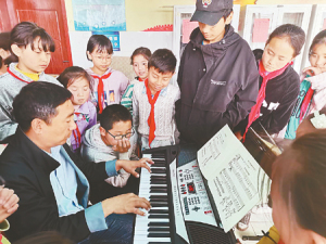 星空彩票ios版中心版驻村干部李玮在给二塘乡中心学校小学生们上音乐课