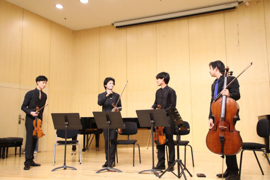最后一个节目是由辉煌四重奏演奏的《贝多芬弦乐四重奏作品18之二 第四乐章:快板-近急板》,演奏者为我校本科一年级的江枕毅、马天炜、纪贺顺与翟子墨。他们依次展示了小提琴、中提琴与大提琴的不同音色,随后带来了欢快愉悦的表演。