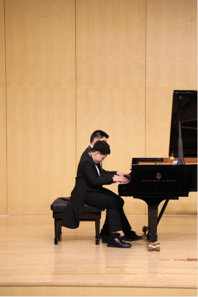 音乐会正式开始。第一个节目是我校附中初一年级孙凡森(中国香港)和初二年级李哲翔的钢琴四手联弹《军队进行曲》。李哲翔同学首先讲解了四手联弹的相关知识,然后与孙凡森演奏了这首生气勃勃、威武雄壮的作品。