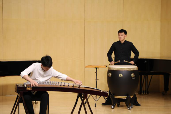 接下来的是附中高一年级刘芷余带来的中国鼓独奏《鼓语》。为了让在场同学们了解中国鼓,刘芷余同学首先介绍了花盆鼓与五音排鼓,并邀请一名化隆学子上台击鼓,二人即兴“合奏”了一曲,引来台下阵阵掌声。刘芷余同学激昂的演奏更是让在场师生深刻体验到了中国打击乐的震撼人心。